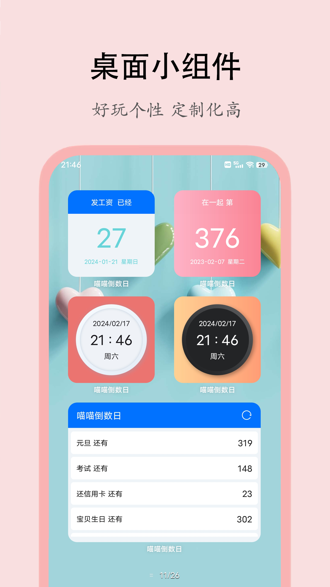 【主要功能】在桌面上显示从距离重要日子的天数,例如生日,恋爱纪念日,发工资等,让您不会错过重要的日子!