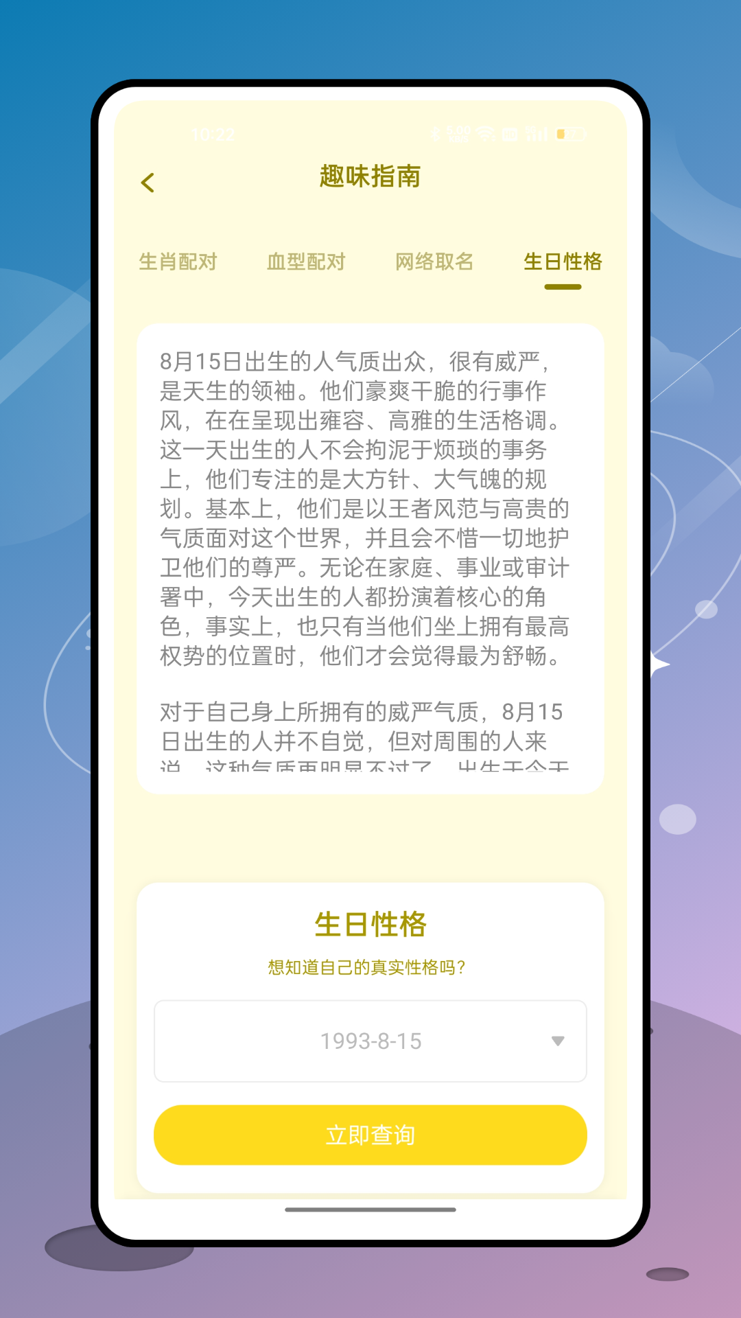 用户能够通过该应用了解出生相关的性格特点。它依据某种特定的理论或者大数据分析,为用户解读出生信息与性格之间可能存在的联系,让用户对自己或者他人的性格有更多元的认识角度。