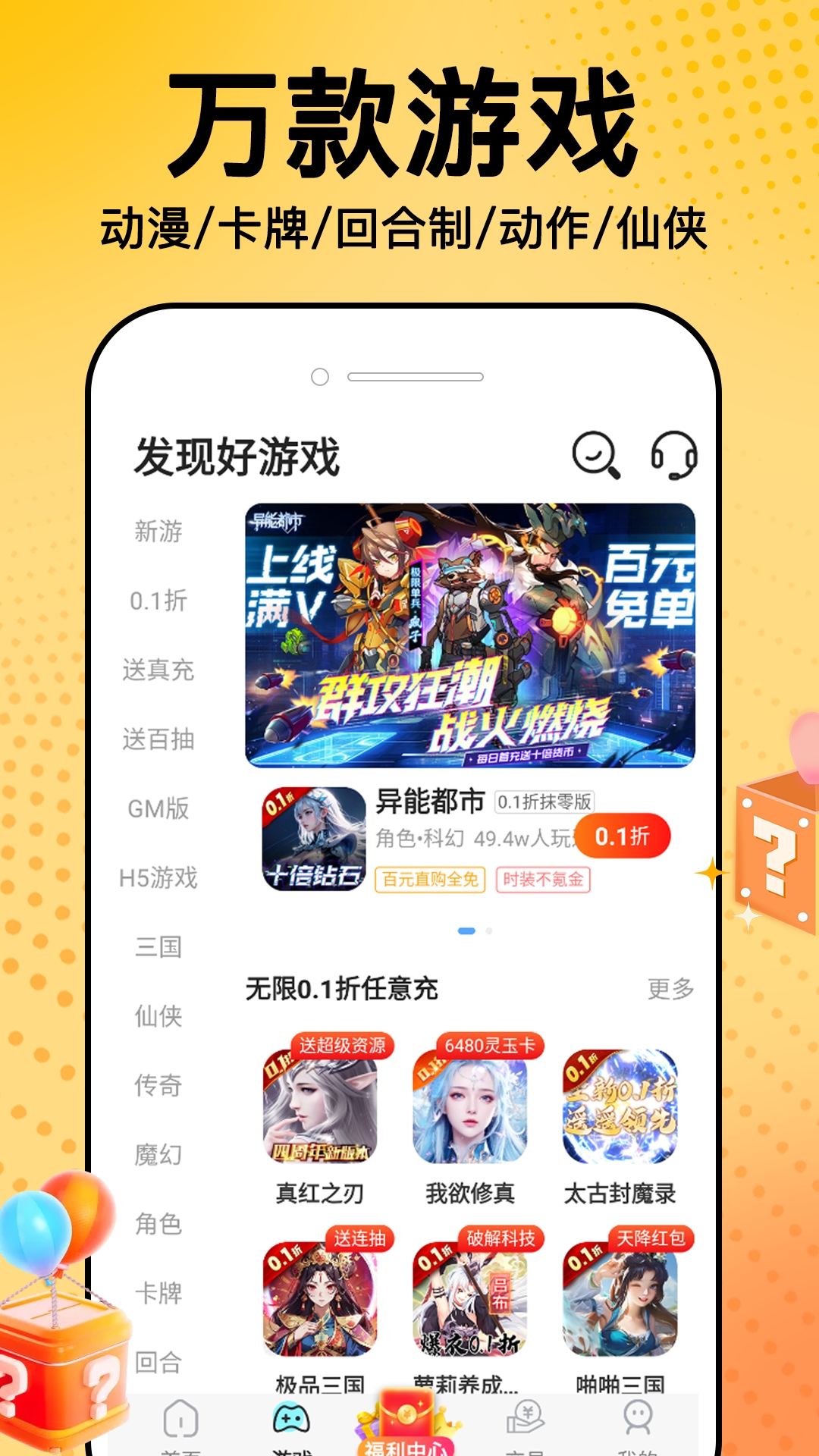 千款游戏的氪金神号,还有海量的福利特权号,超低价的0.1折福利都汇聚于此。有了它,即便不花钱也能体验土豪般的游戏乐趣哦。