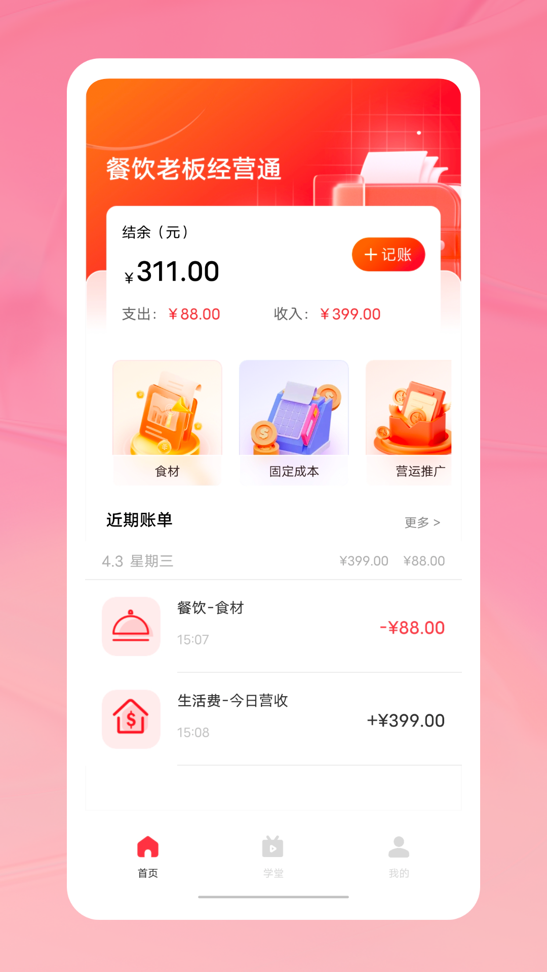 这是一款为一个餐饮老板或餐饮经营者准备的app,做为一名boss或是想加入餐饮行业者希望:“无论我身处何处都能随时掌握店内的实时营业状况,对营收开支全盘把握,即便有多个品牌、多个城市、众多门店我也能够一目了然的掌握我关心的核心营业指标数据。例如:记录流水、实收、人均、支出、收入、成本收款占比等,还能在碎片化的时间里学经营之道,了解时下餐饮业运营,开网点、网红点、与平台合作等信息。