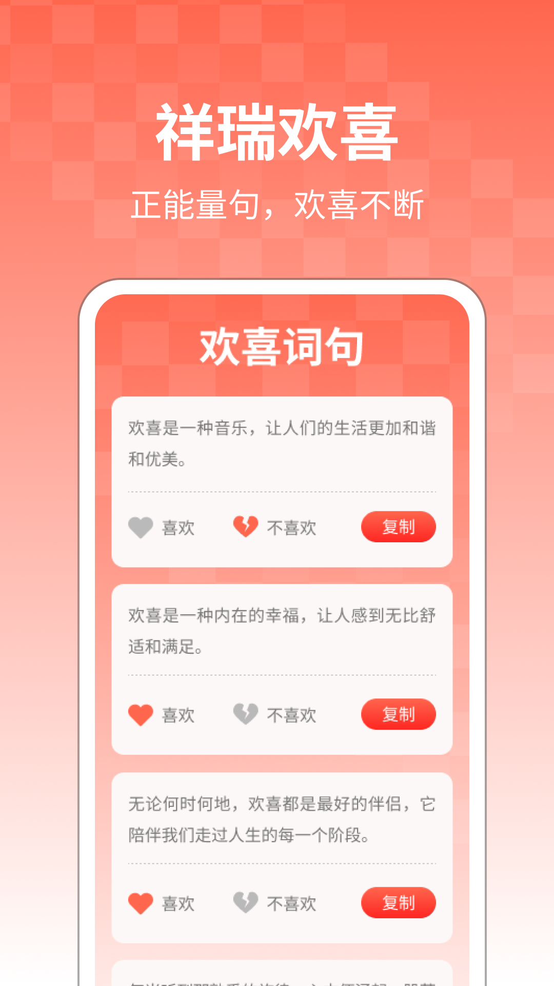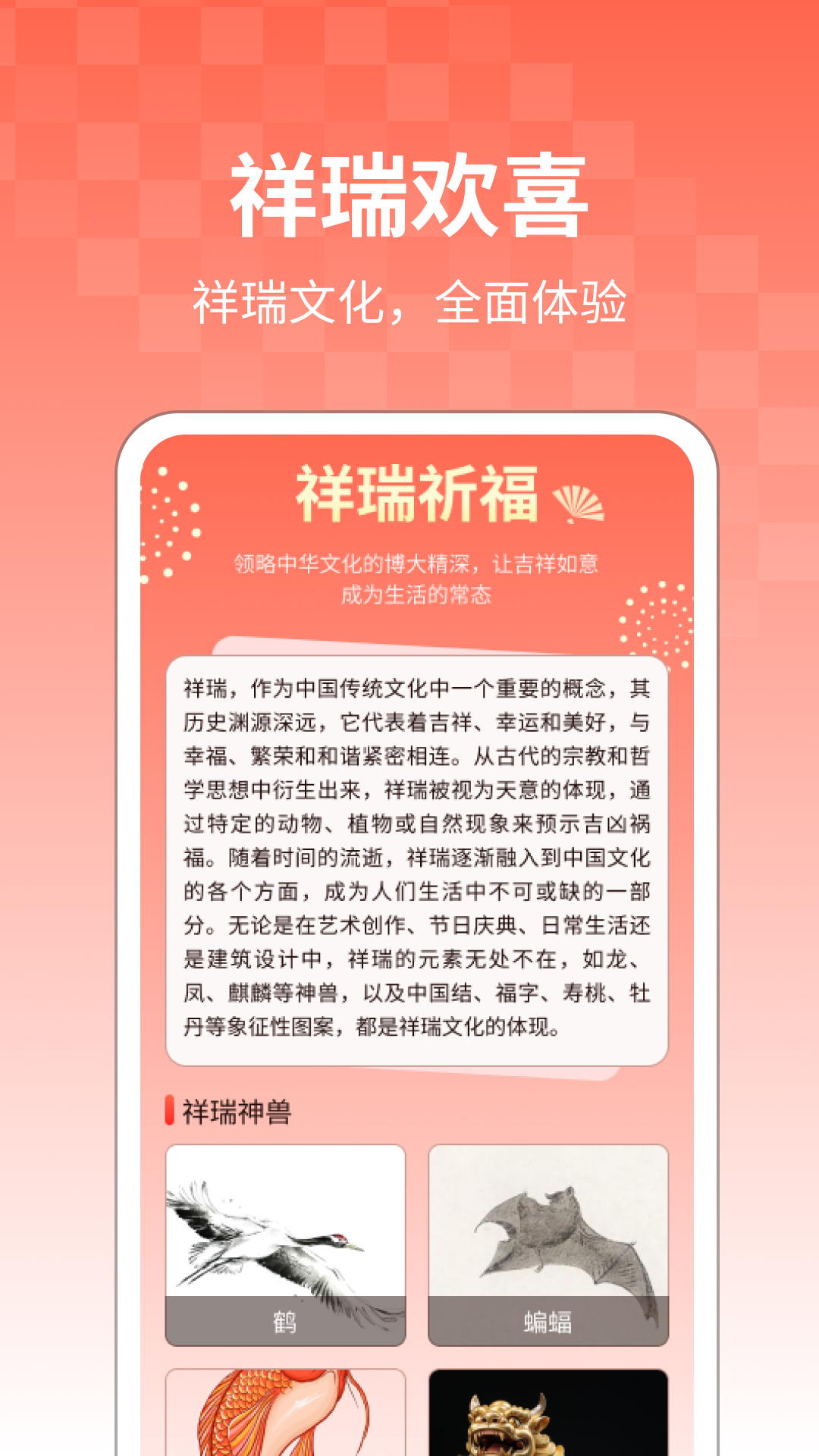 “祥瑞欢喜”APP是一款应用平台,为用户提供全方位的祥瑞文化体验。不论您想了解祥瑞的含义、探索祥瑞神兽的传说,或寻找正能量的欢喜词句,能满足您的需求。立即下载祥瑞欢喜APP,深入了解祥瑞文化,探索祥瑞神兽之谜,获得正能量的欢喜词句!愿您在祥瑞欢喜APP中享受愉悦和启发!