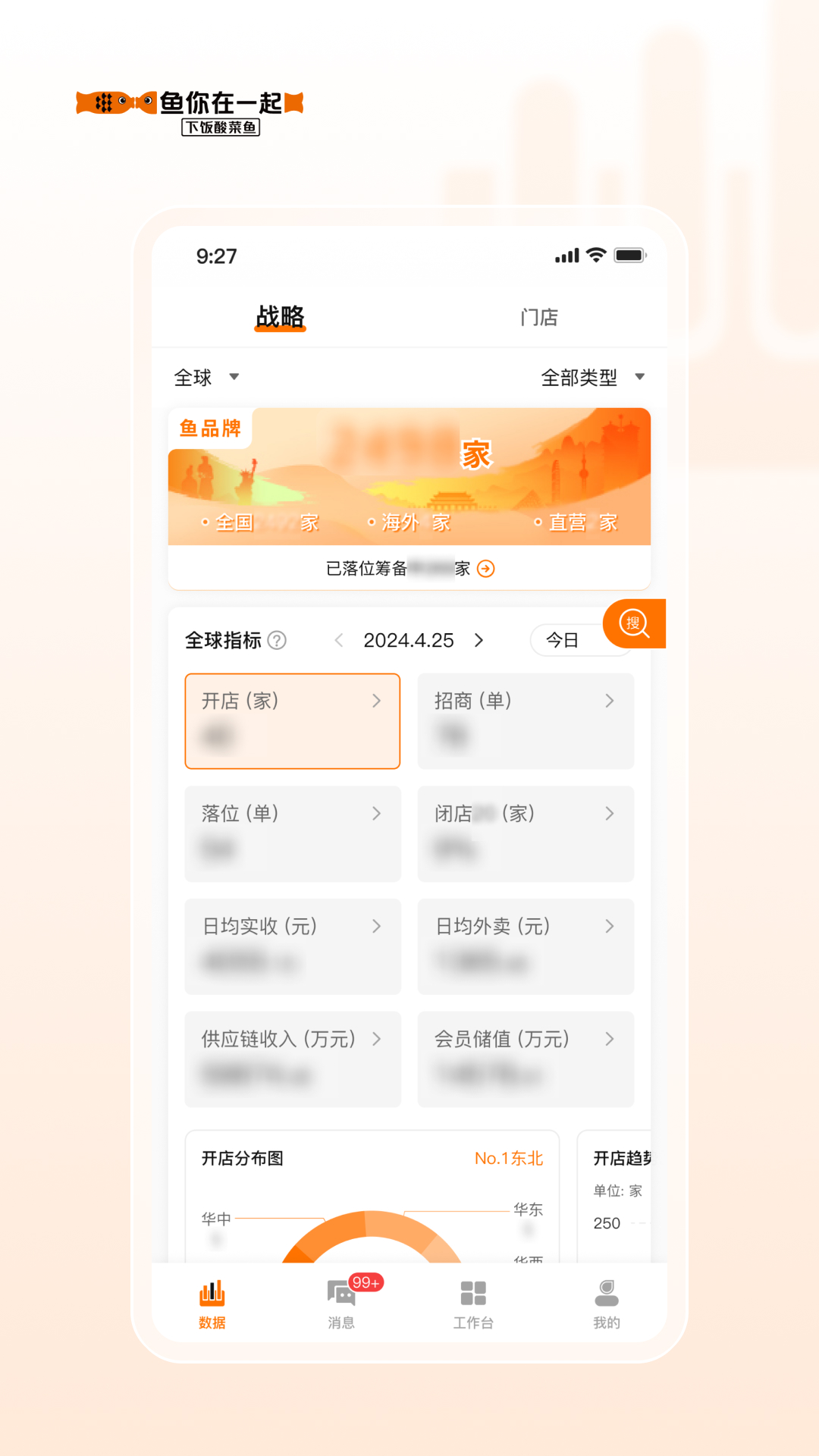 鱼司令是鱼你在一起营运管理层的实用助手,它可以展示门店数据汇总、排名、趋势分析、达成率、门店智能筛选、数据可视化、智能工作台等,数据及时准确,给管理人员带来便捷高效的使用体验。