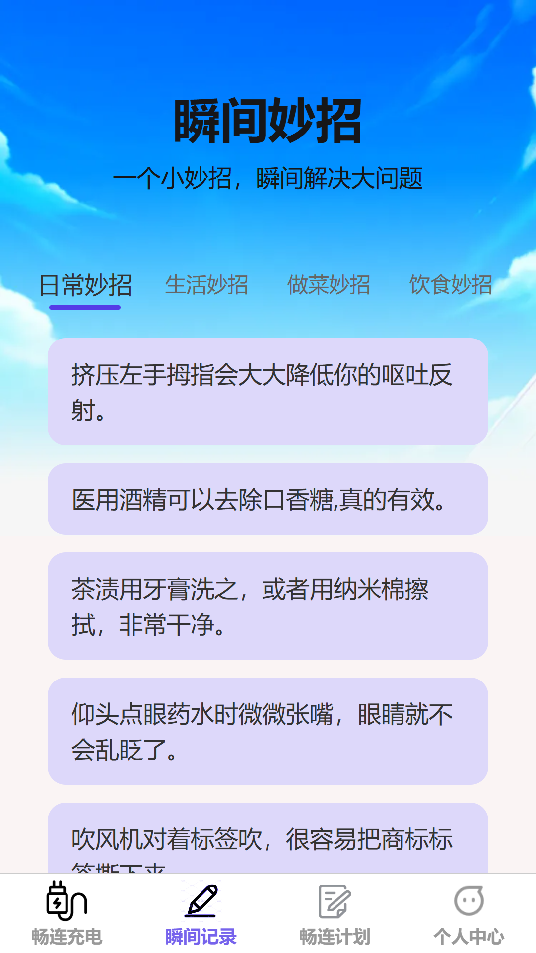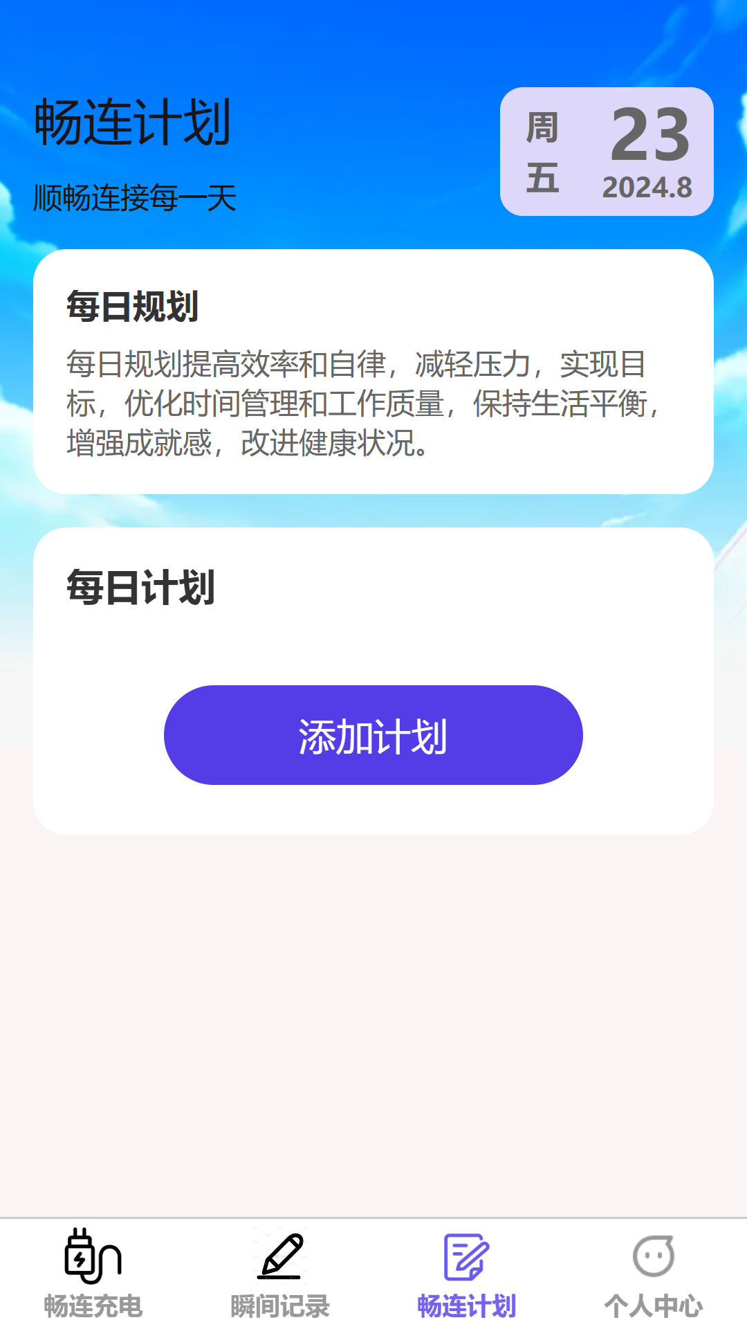 畅连瞬间,这是一款将充电智慧、生活妙招以及计划管理完美融合的全能型应用,致力于为您塑造更为便捷、高效且充满趣味的生活感受。在畅连瞬间里,每个瞬间都蕴含着无限可能,每一次连接都会使您离理想中的生活更近一步。
