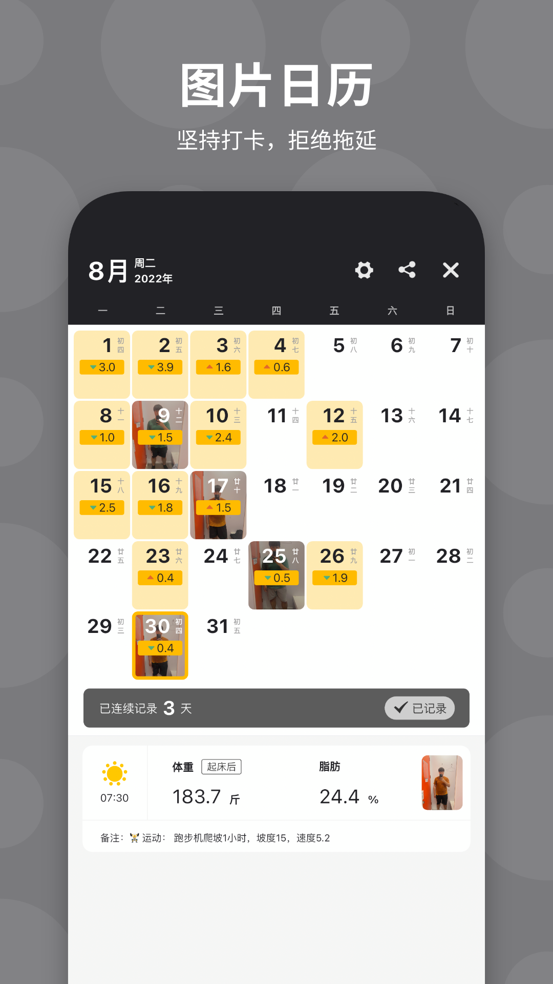 不管您是想要减肥、增肌,还是保持体型,体重日记都能细致地为您记录下每一个相关的点滴瞬间,它愿陪伴您一路成长。