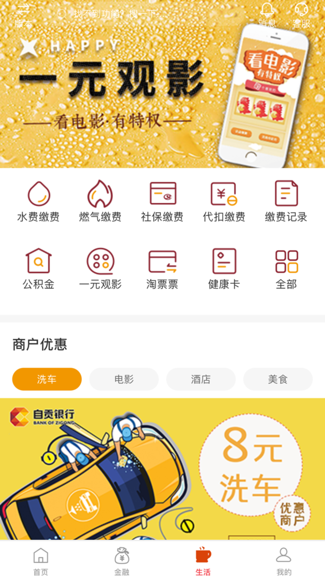 【便民生活】:生活缴费、公积金查询、电子健康卡、一元观影等功能,全力提升客户便捷生活服务体验。