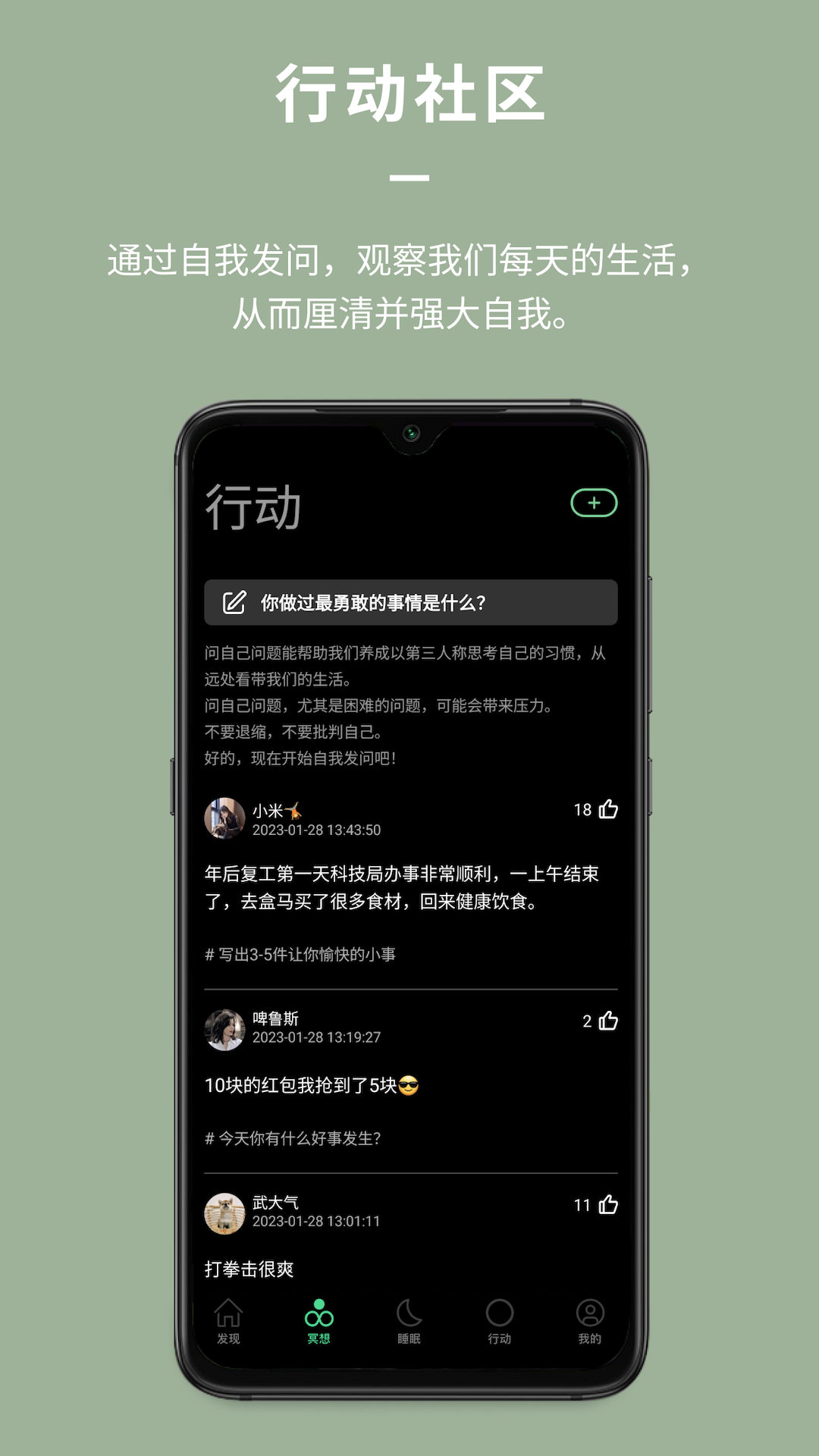此外,有一个行动社区。正如萨特所说,“存在即行动(to be is to do)”,行动社区期望您通过自我提问、对话以及一系列探索生活的练习,去观察并创造我们的日常生活,进而梳理清晰自我并让自己变得强大。