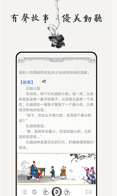 内容大部分配备“白云”老师深情的朗诵、准确的拼音、完整的注释、甜美的译文、易懂的启示、有趣的故事、水墨风图画、还有实用/易用的录音跟读学习功能。