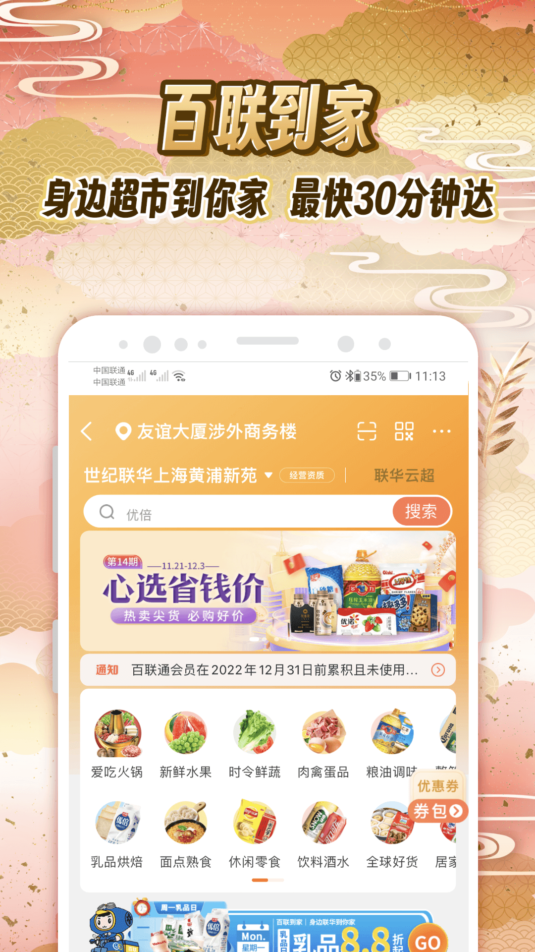 “百联到家”服务,超市商品可在线上下单,然后快速速递到家。该服务由联华、华联、世纪联华、快客门店、Leme精品超市等500多家门店提供商品支持,商品种类丰富,品质好且价格优惠。