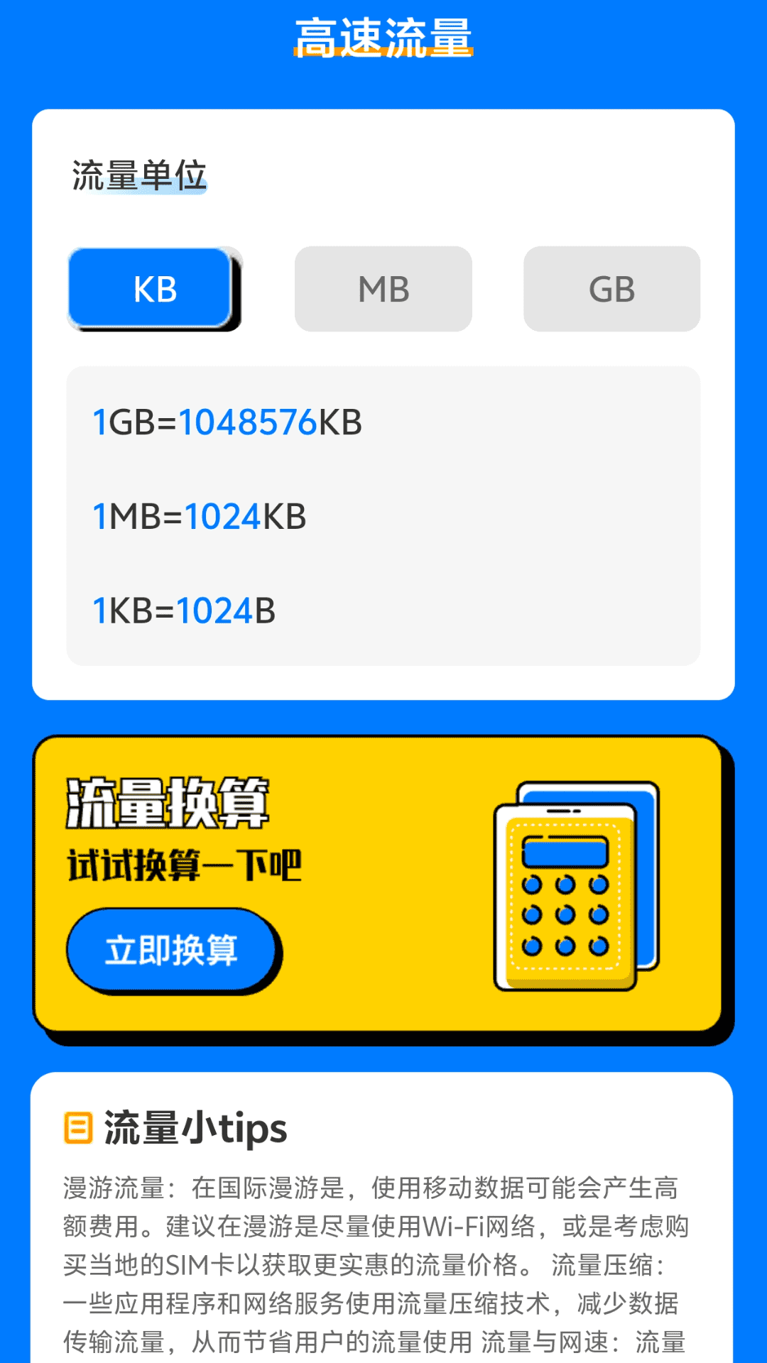 告别繁琐的流量计算,尽情享受流量换算的快速体验。高速流量内置的流量换算器,具备强大的瞬间换算能力,无论是工作中需要的精确计算,还是日常生活里的简单换算,它都能迅速且精准地完成,从而助力您取得事半功倍的效果。