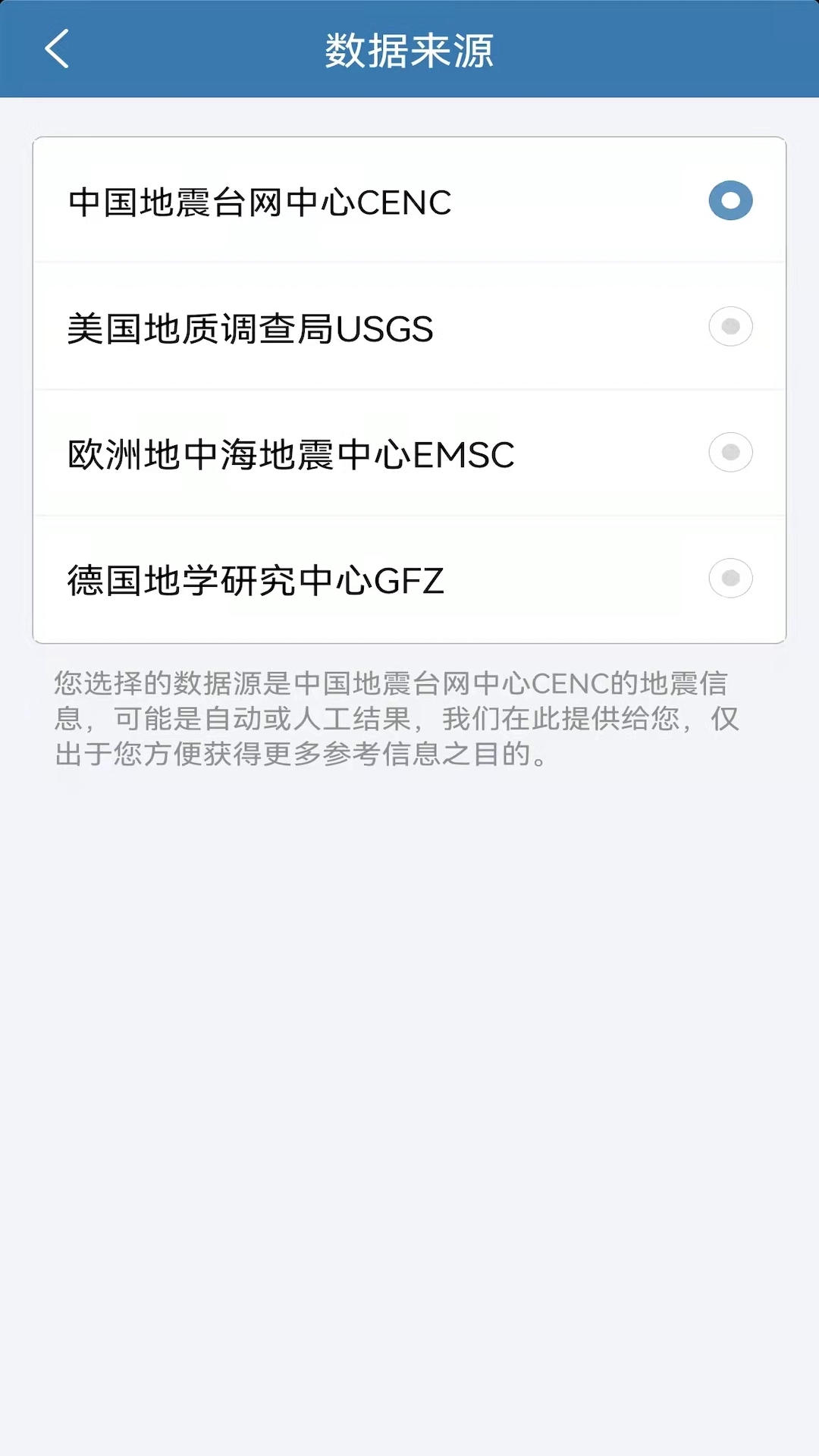 7. 除了国家地震台网的最新地震消息之外,还会提供美国地质调查局(USGS)、欧洲地中海地震中心(EMSC)以及德国地学研究中心(GFZ)的最新地震消息。