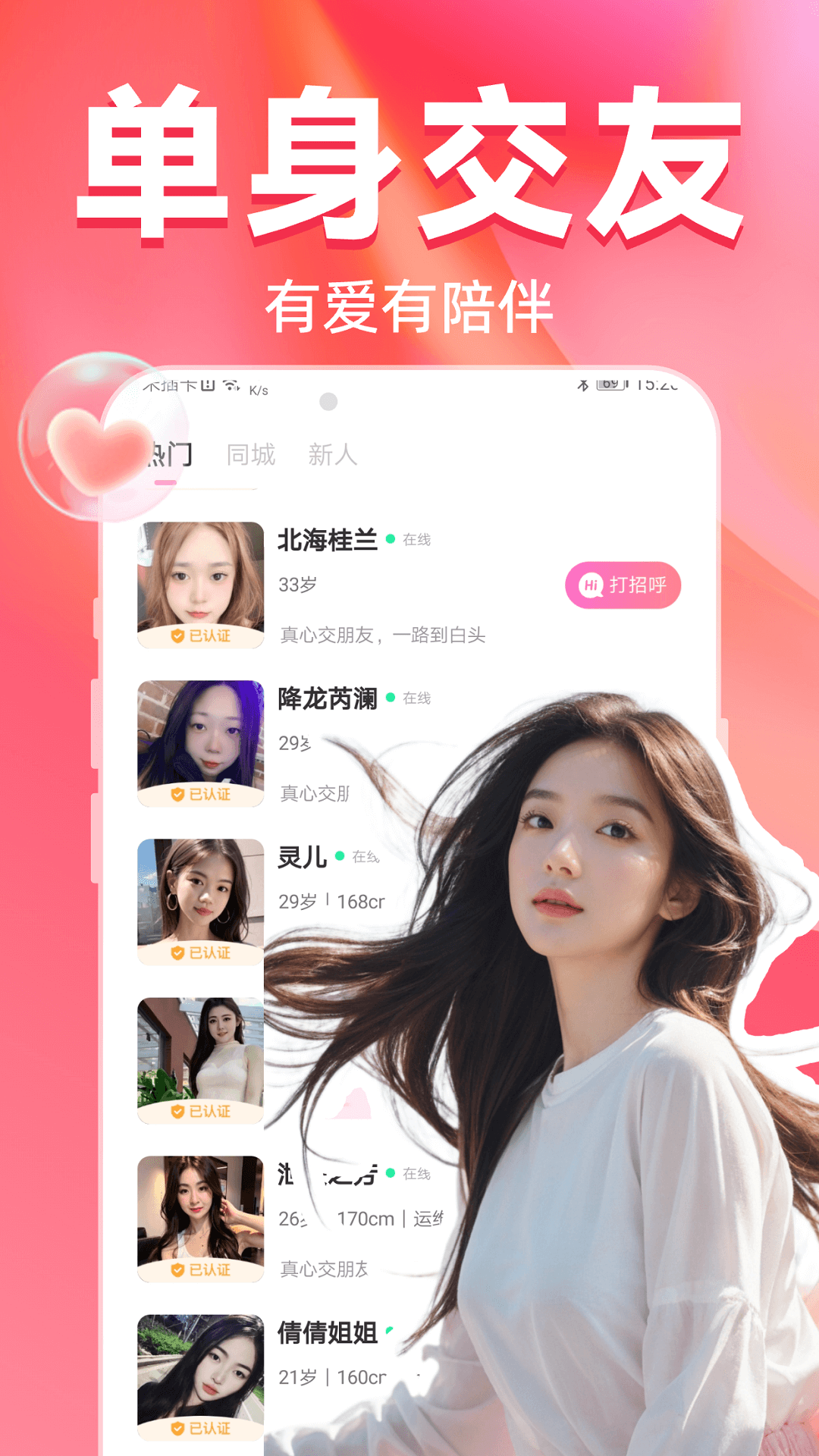 同城寻爱:这是一个能精准匹配同城单身异性的优质平台,为您带来全新的视频交友体验!在这里,您可以享受高清互动,它能够打破社交距离的限制,让您真实地感受到彼此的热情与温度。