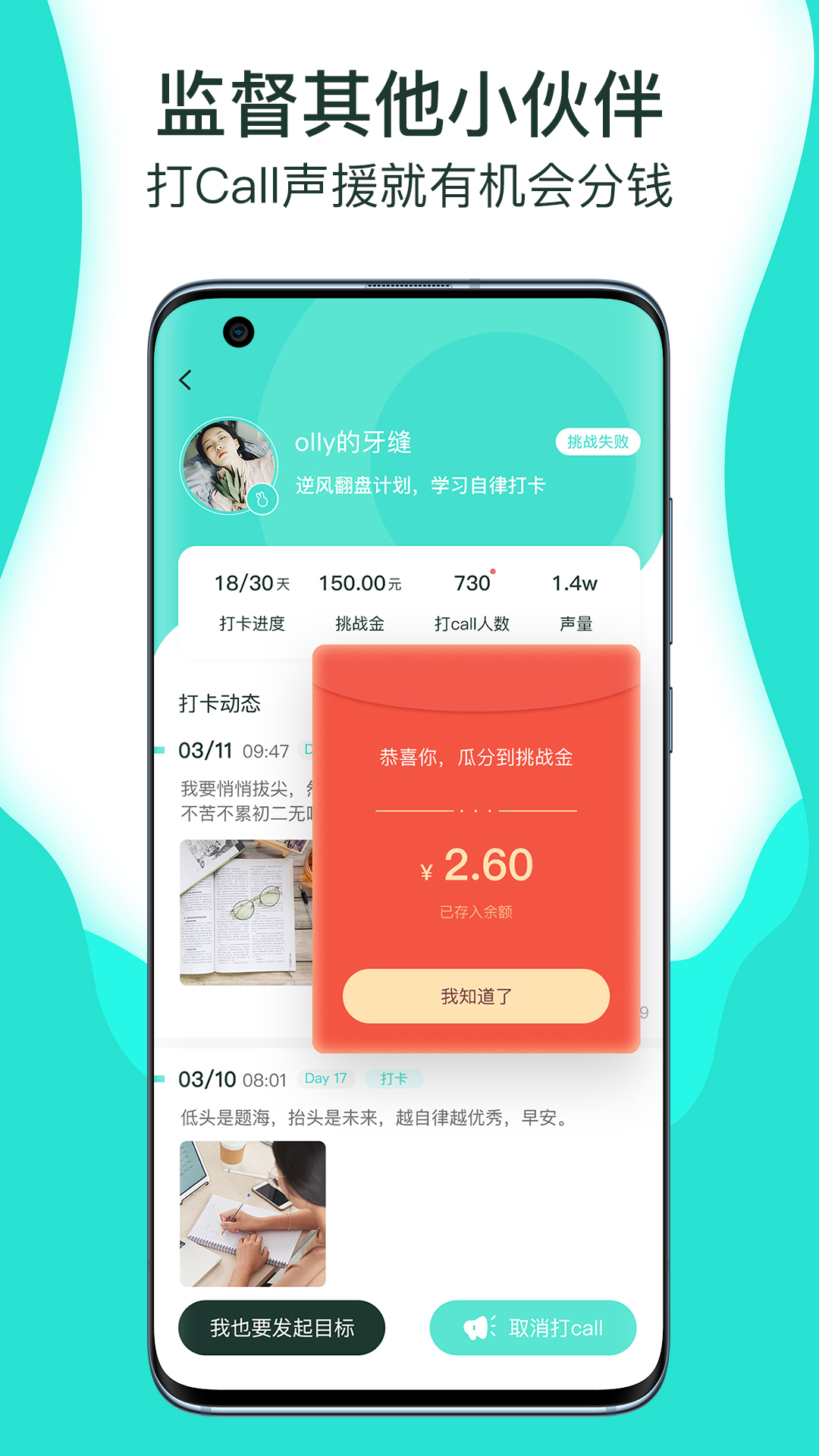 • 打Call分钱:在目标广场上,你可以为他人的目标打Call助威,鼓励并督促对方达成目标。要是这个目标不幸失败了,为他打Call的你就能够参与瓜分目标挑战金呢。