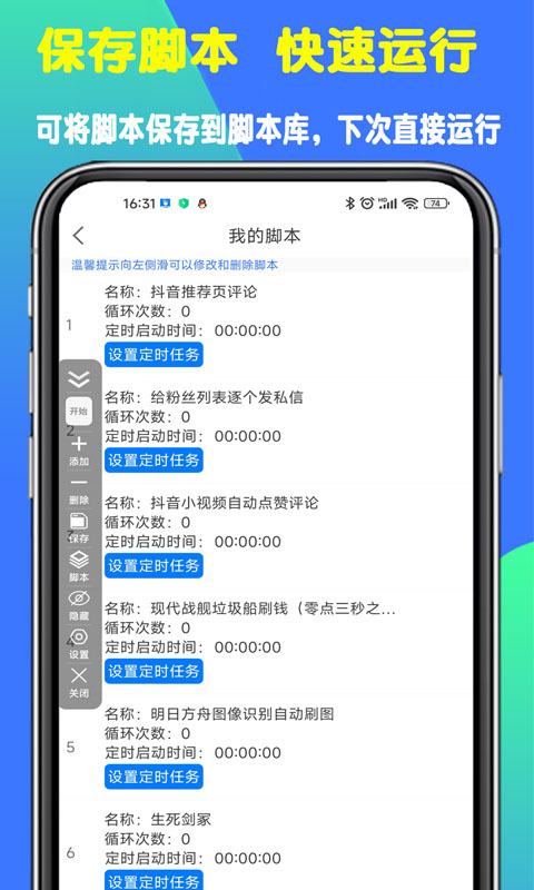 其九,支持储存和加载自定义脚本,还支持定时启动和定时停止功能。