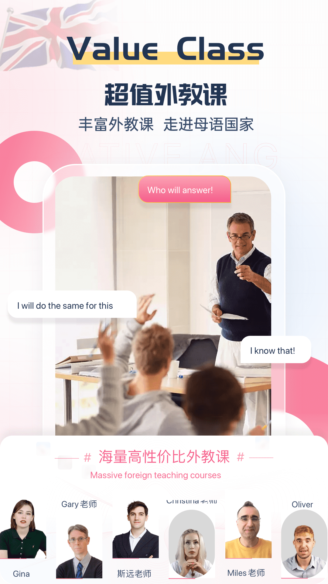 真人外教提供纯正发音,词根词缀可巧妙记忆海量单词,句法语法公式能一通百通,口语9000句可畅行天下——快速学习英语,未来已触手可及。