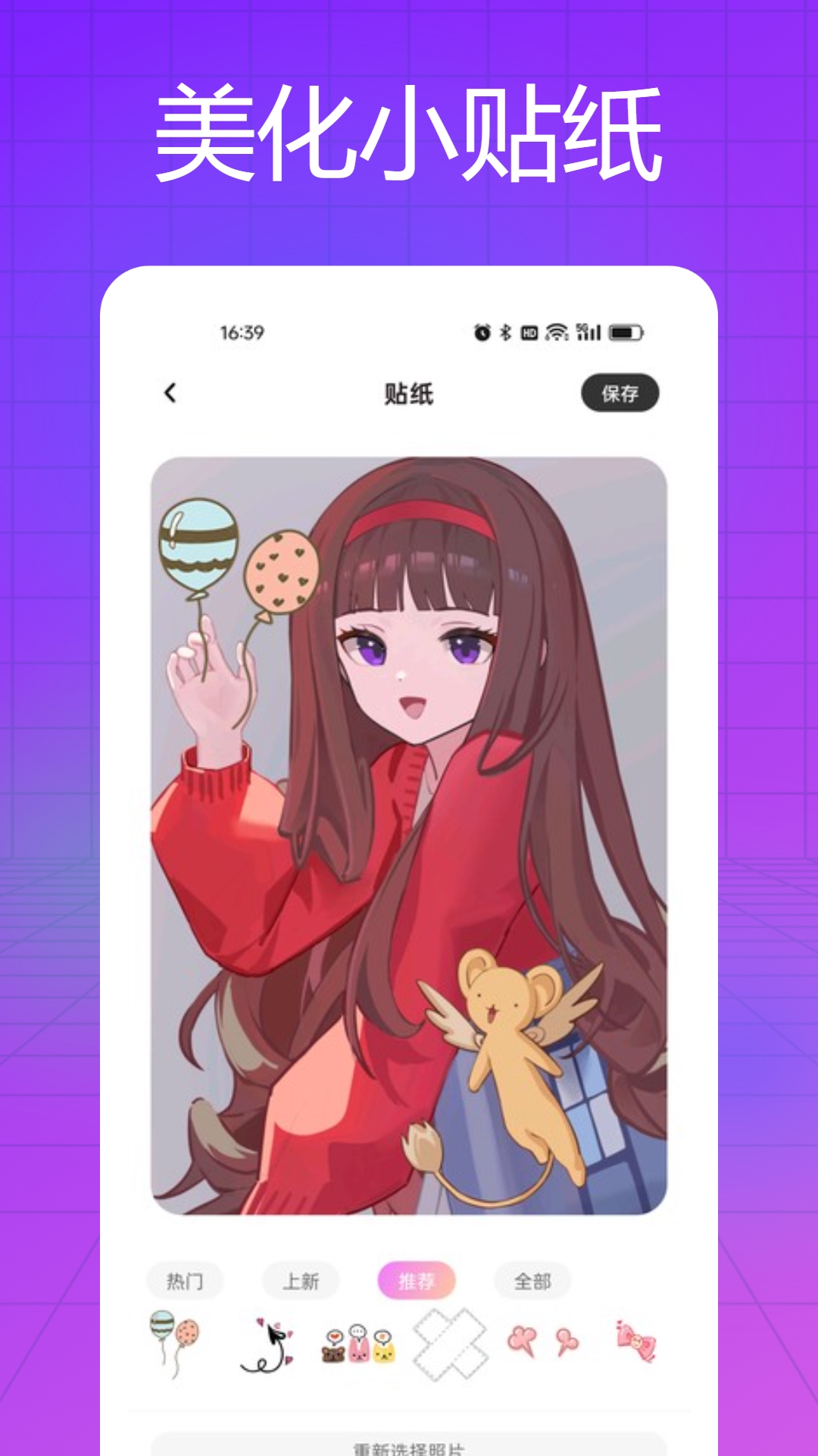【图片贴纸】一键添加贴纸功能,各种类型的小贴纸应有尽有,它们能为您的照片增添别样的精彩。