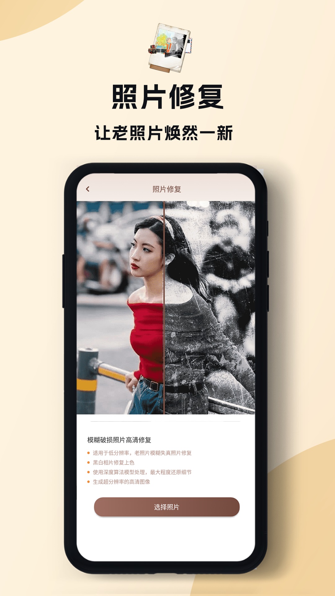 运用AI照片修复技术,借助增强、清晰、补色等功能,实现面部表情的高清修复,让老照片重焕生机。不管是模糊不清的老照片,存在深度划痕的老照片,还是残旧破损的老照片,都能轻松一键修复。