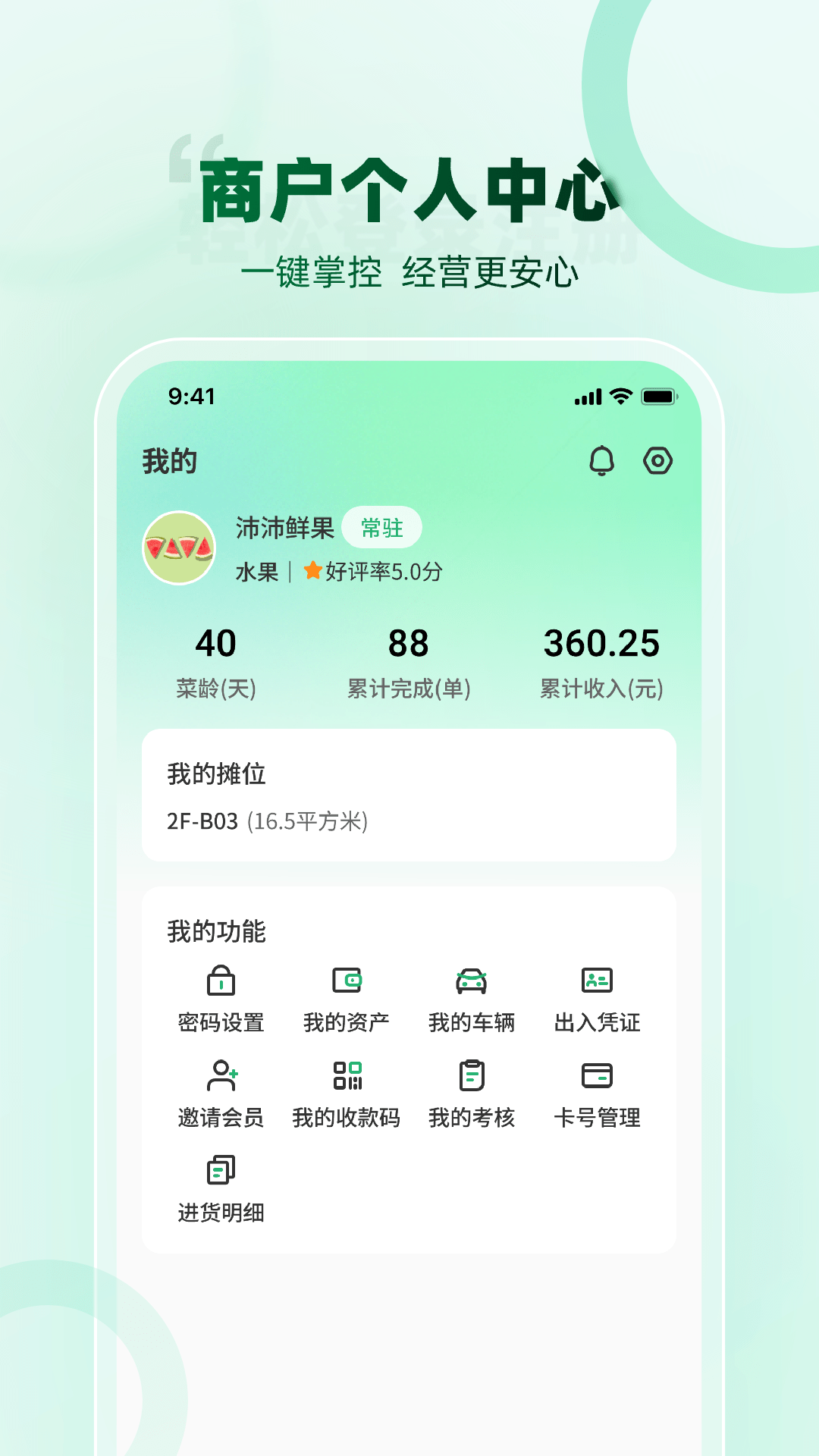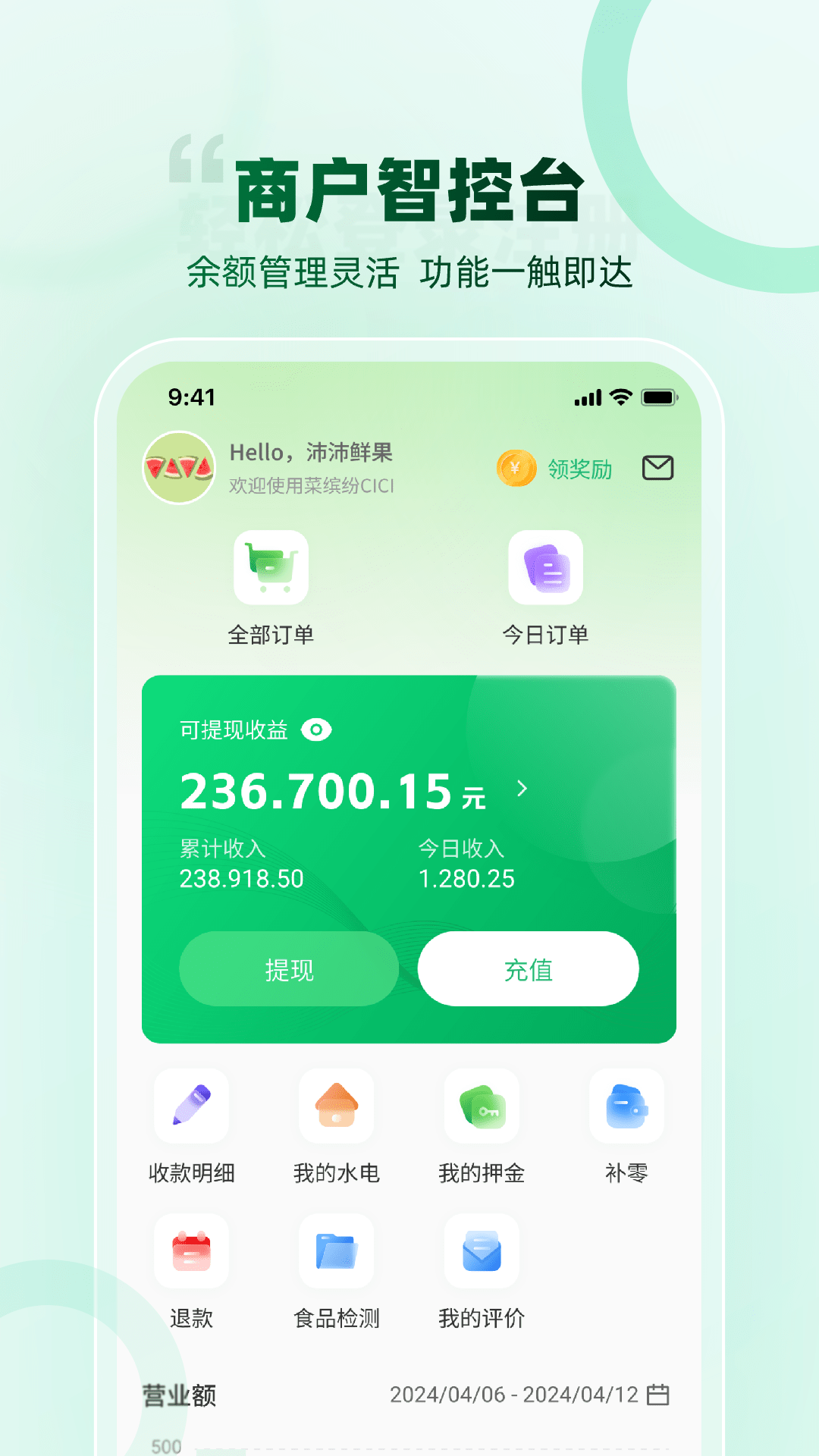 农贸商户查询自己数据的一个辅助工具,可以查询自己的所有订单、营业额、订单评价,还可以进行水电费缴纳等等