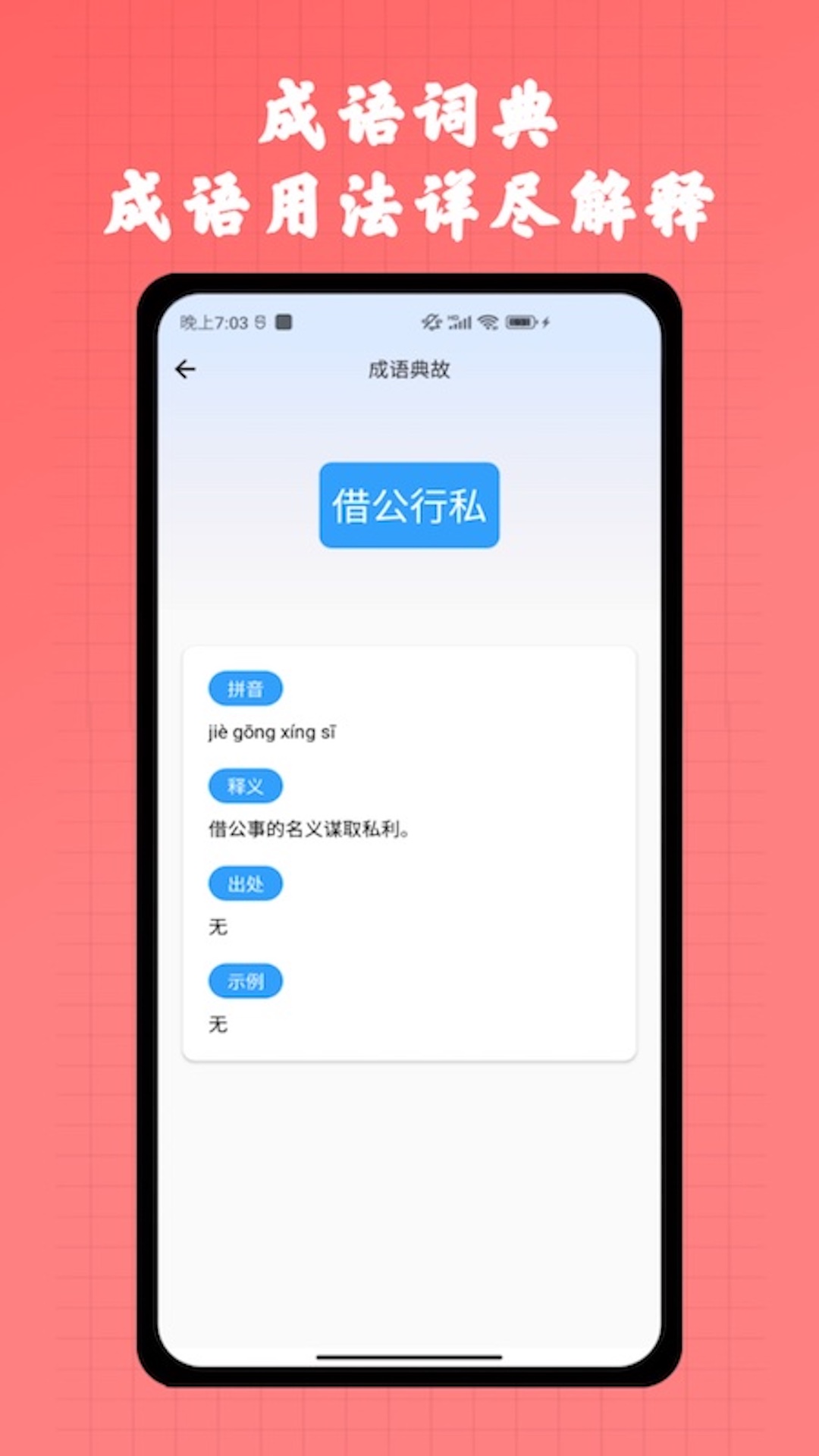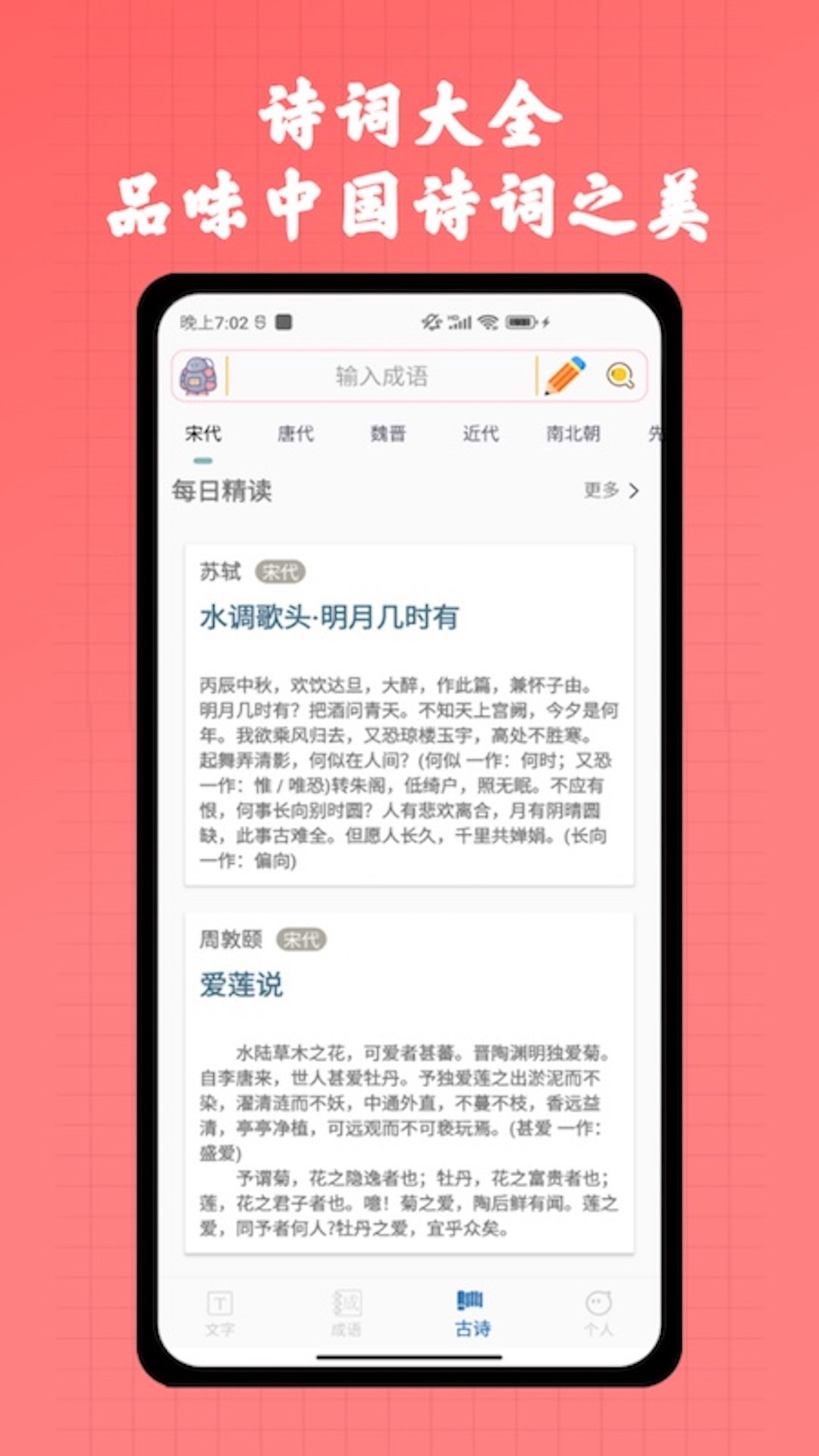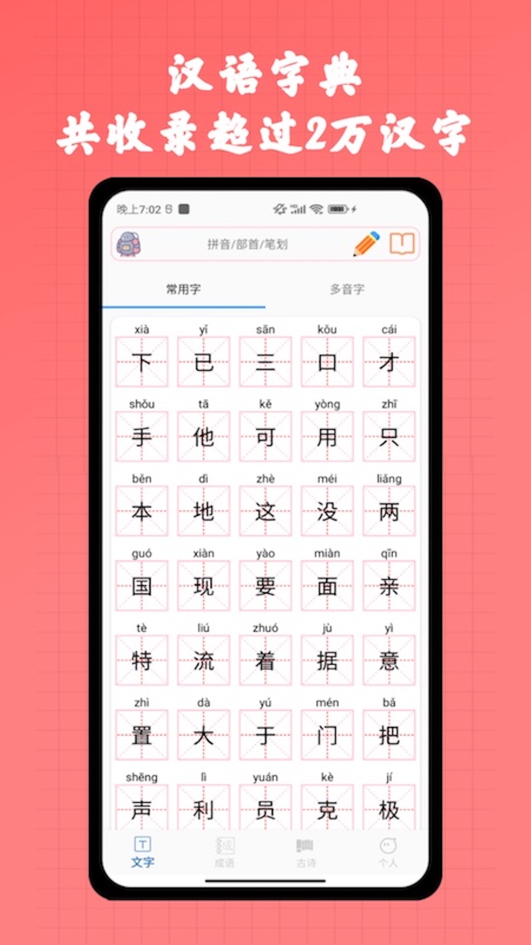 一款功能丰富、实用性强、适用范围广泛的大型字典词典类APP,字典共收录超过2万汉字,容纳了现代汉语通用字、常用字,超大词汇量,词典包含超过5000余个成语用法权威详尽解释,包含每个成语拼音、释义、出处、例句等提供快速搜索和详细搜索,提供众多诗词,涵盖各类诗词场景,品味中国诗词之美。