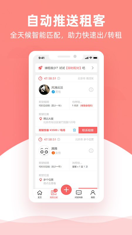 当你录入房源之后,系统会马上根据房源来匹配正在找房的租客需求。一旦有完全符合房源要求的租客,系统就会把租客信息推送给你,到时候你只要去联系租客发起沟通就好啦,不需要花费时间去推广房源哦。