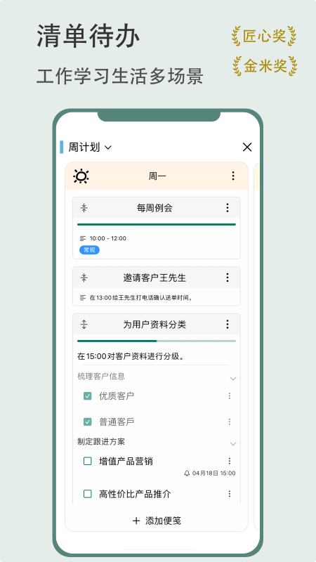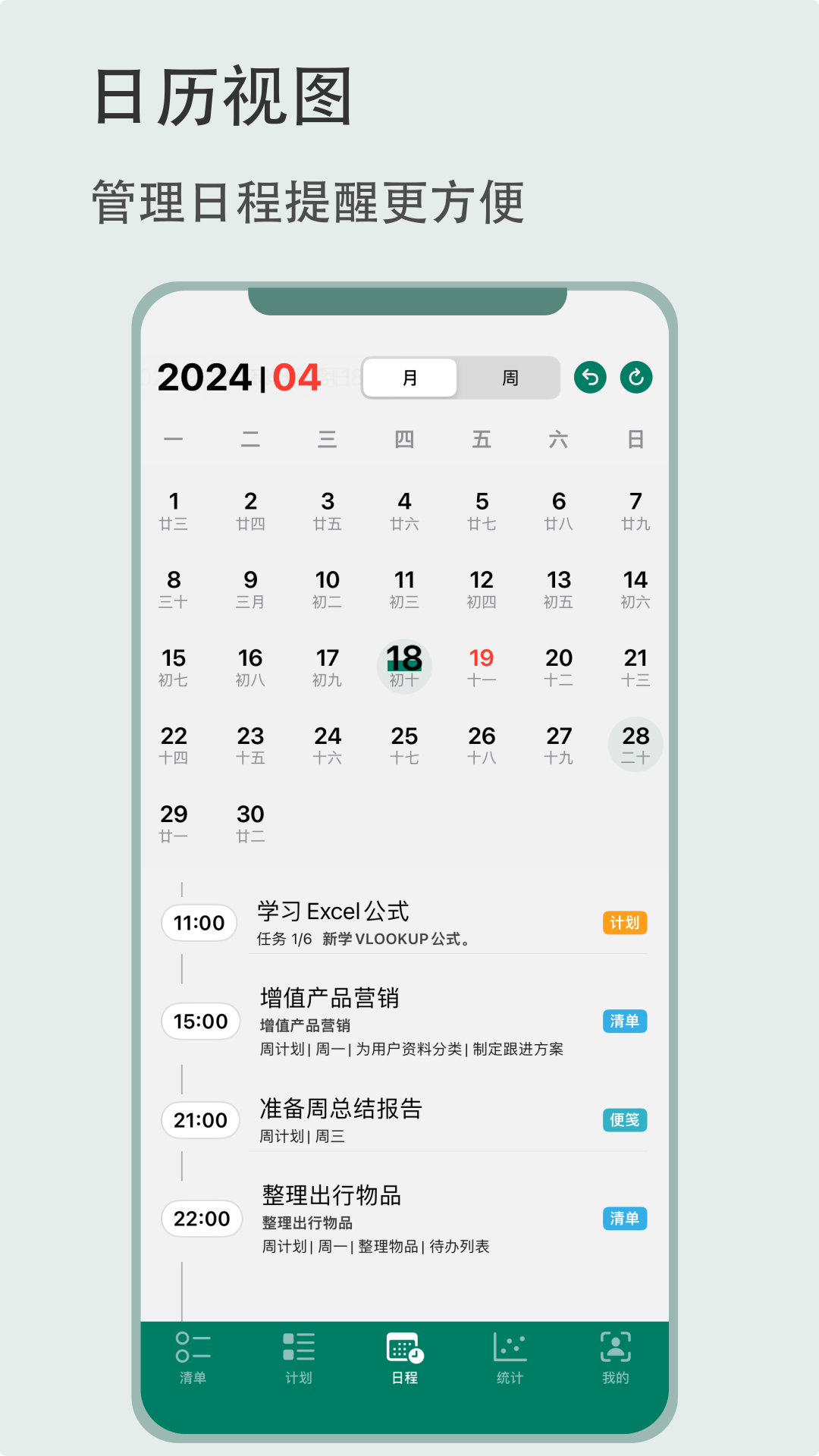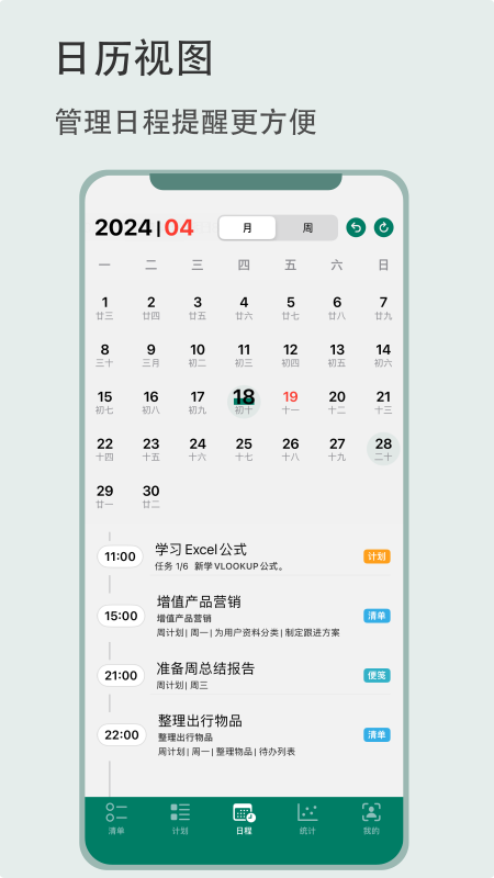 有个计划的日历视图能让日程安排一目了然,时间轴功能则让清单与计划有机融合统一。