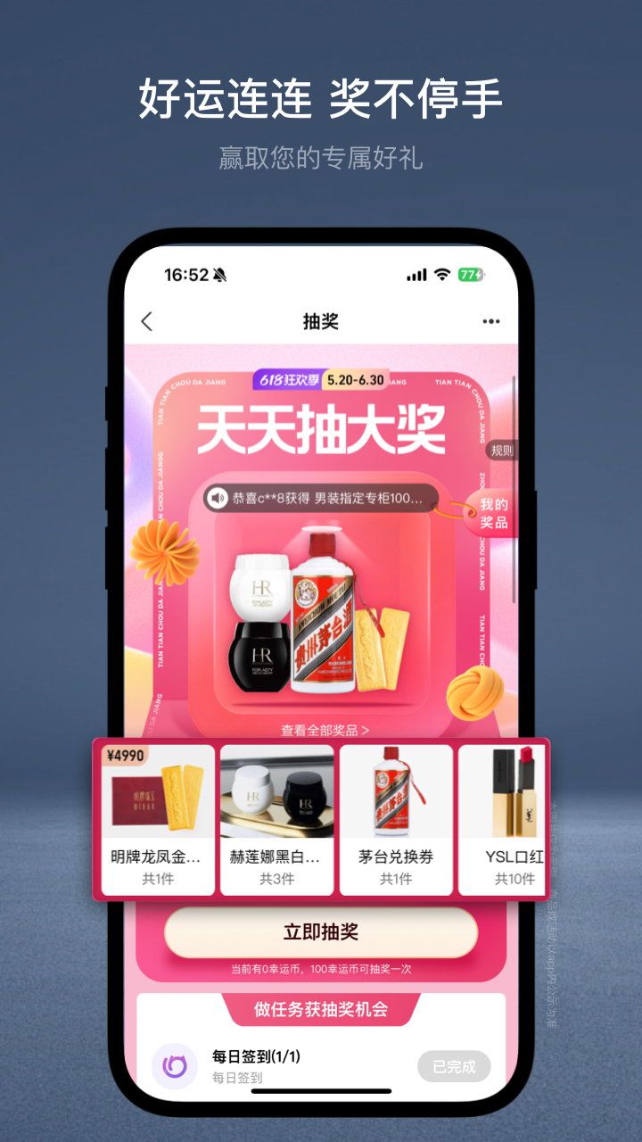 1、618集碎片赢好礼活动来袭! 2、AR试妆/试戴:大牌美妆、腕表在线试色、佩戴,体验即时上身效果; 3、AI试穿玩法上线:精选专柜大牌美衣等你试穿体验 4、天天来抽奖,茅台、口红大奖等你来抽!