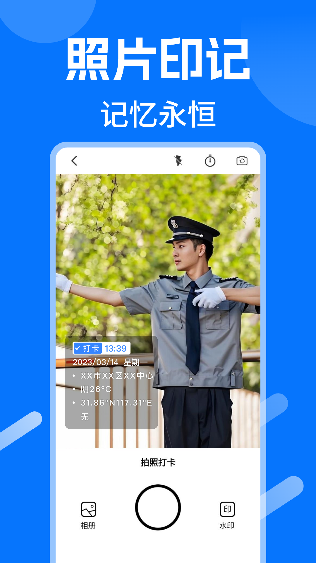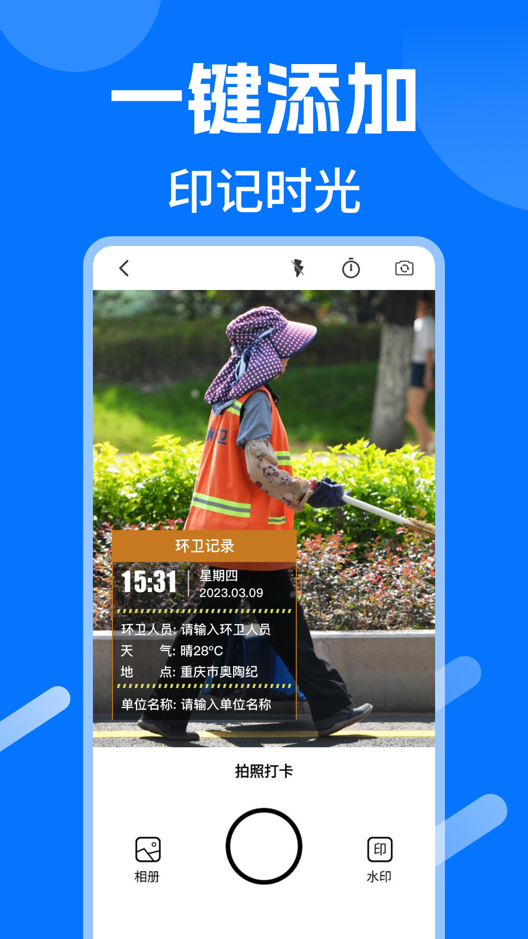 时间水印相机打卡,精准定位,高效工作打卡拍照。支持工作考勤打卡的水印相机,可以自定义的工程水印相机,工作时间地点随时记录。超高清拍照和视频水印录制,水印记录更清晰真实,满足外勤工作定位打卡的一切拍照需求。