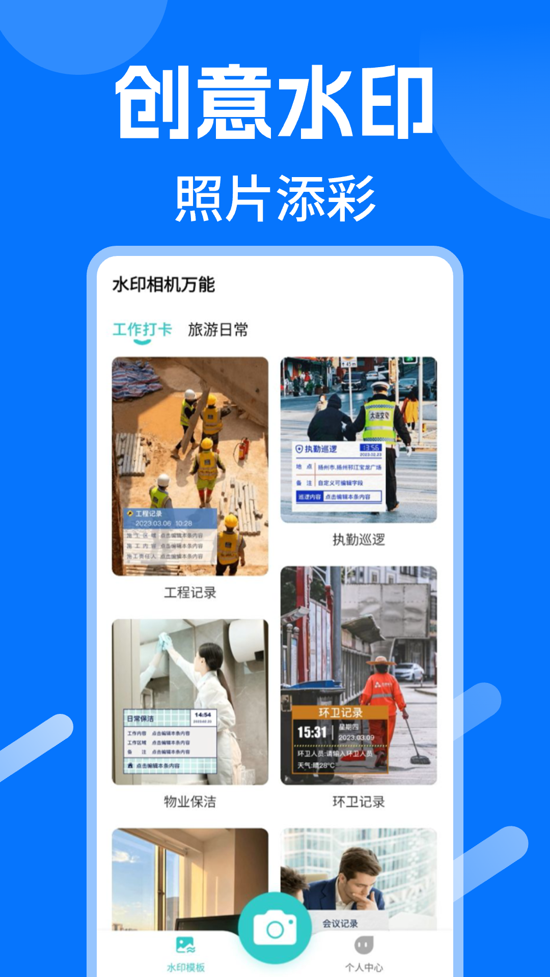 丰富的相机水印模板,满足日常考勤定位打卡,工程记录水印相机、现场拍照,工作时间记录、外勤工作拍照等需求。