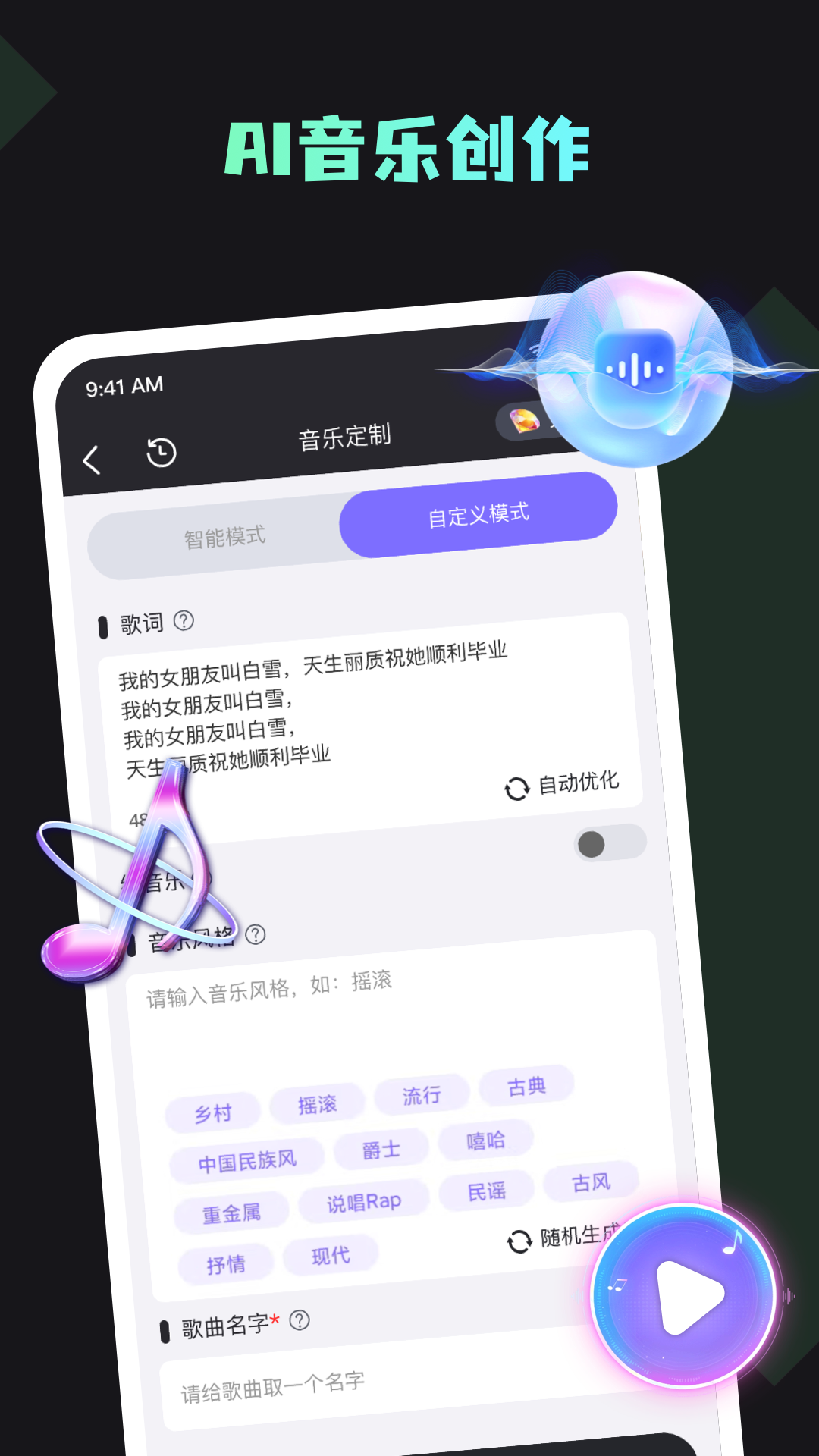 【一键创作音乐】:输入描述,选择音乐风格,一键输出原创音乐