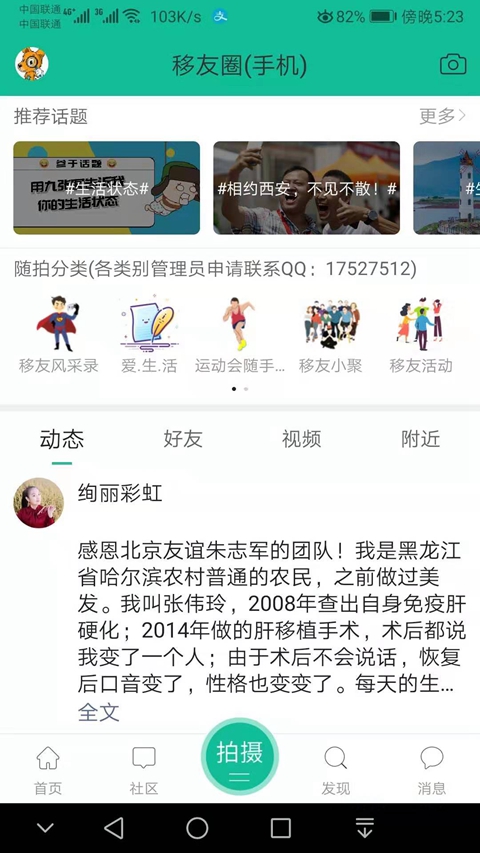 移友网app是由移植人自主创建的。它集资讯、社区、活动、话题、动态、视频、随拍等多种功能于一体,能全面满足移友在交流、互助方面的需求。