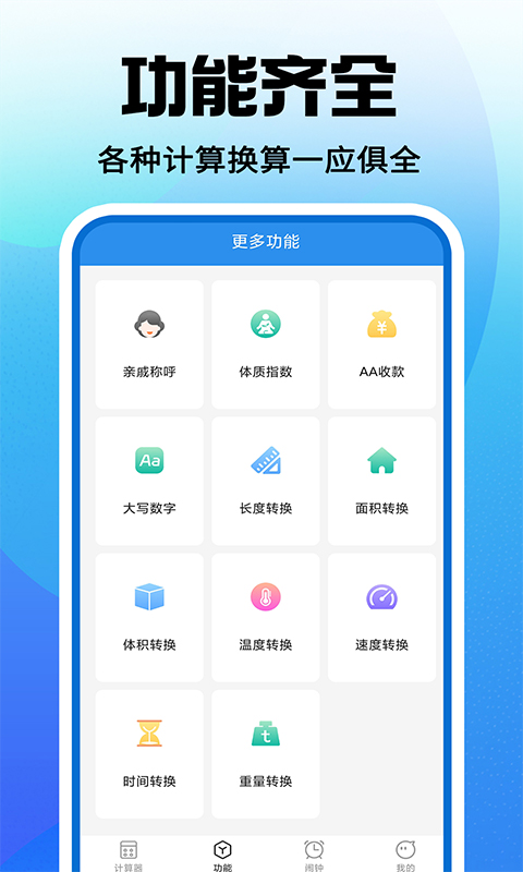 - 支持压强、容量、长度、面积、体积、温度、速度、时间、重量、功率、热量、力等多种单位的转换,功能十分强大。