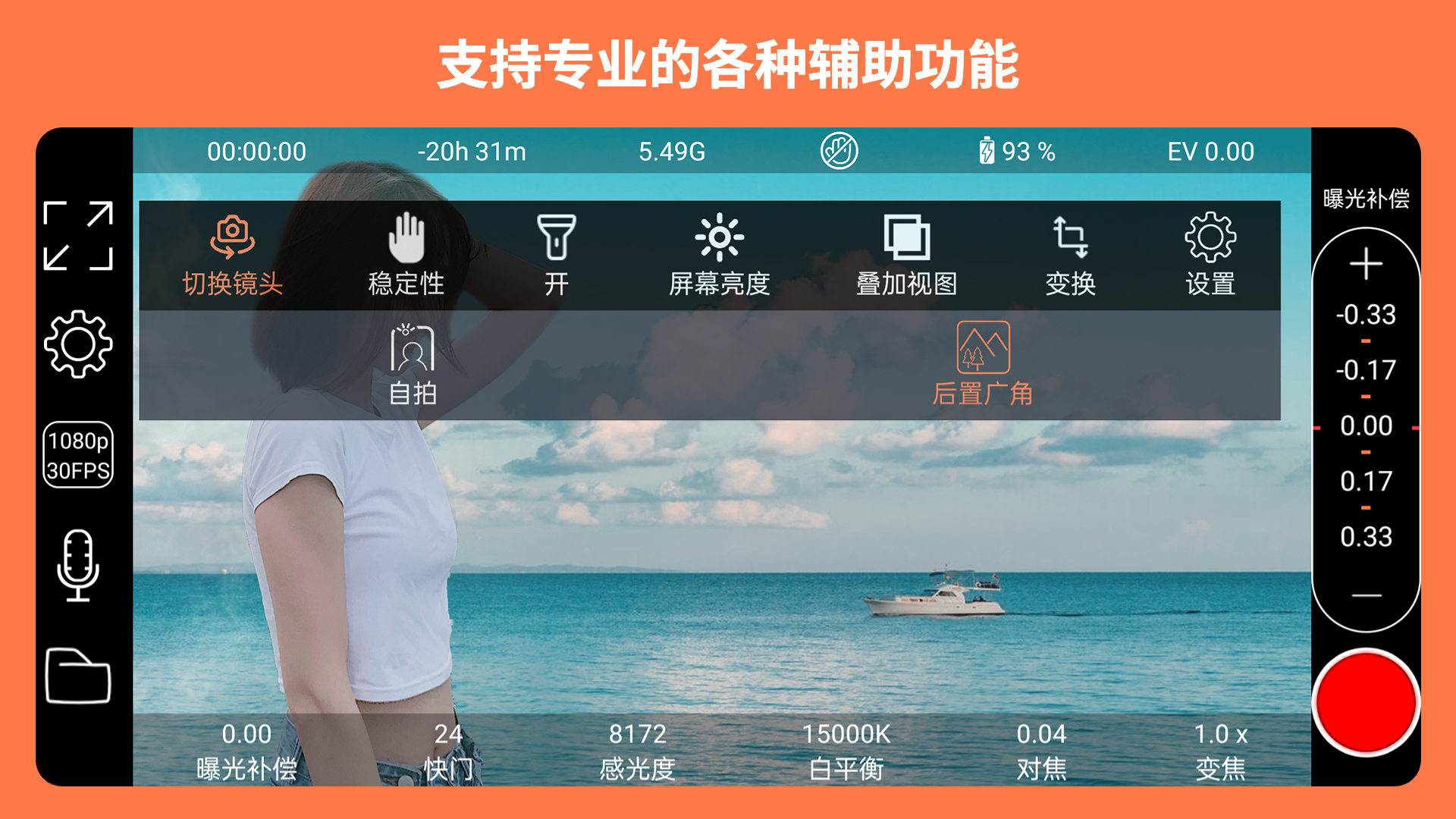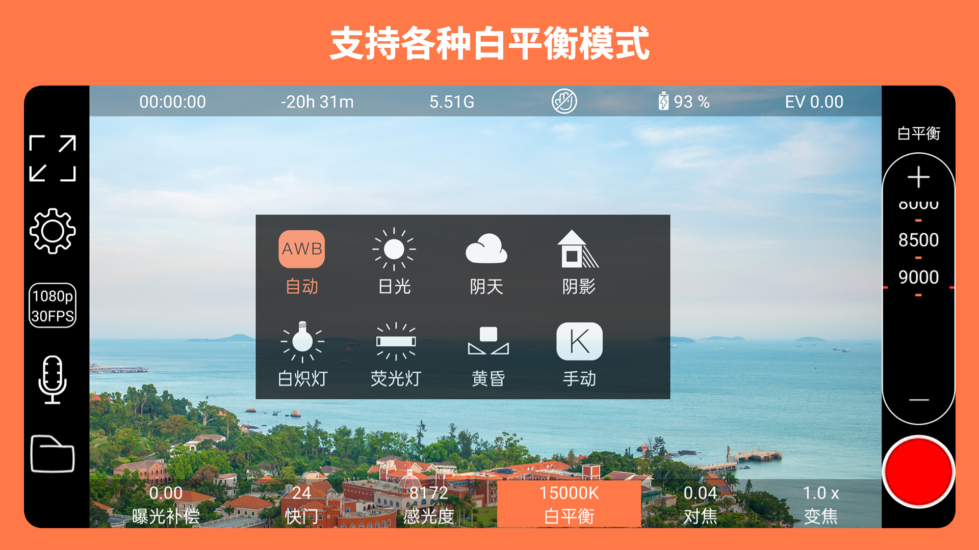 - 支持手动控制/锁定功能,包括快门速度/灵敏度(ISO)、色温、对焦等。