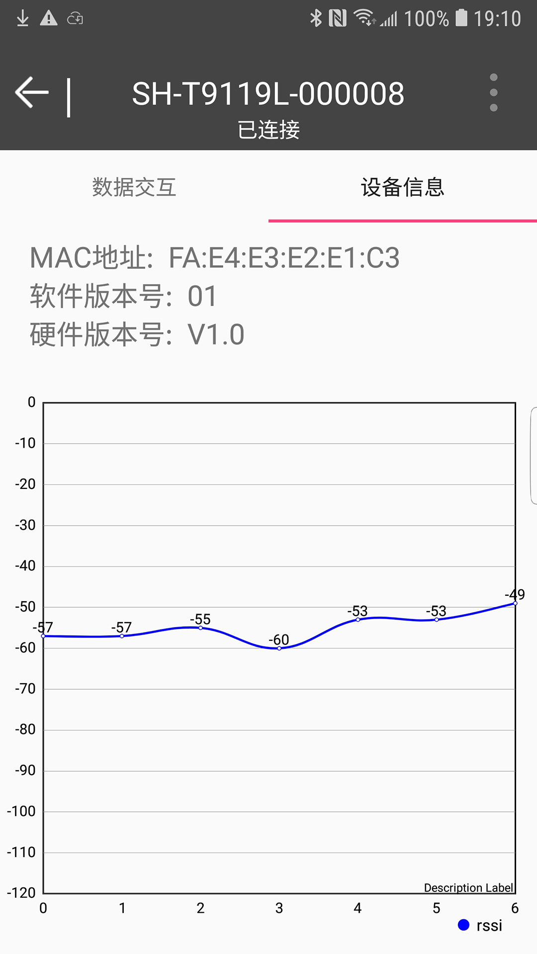 其五,能够显示BLE蓝牙基本信息,并且以折线图的方式动态显示Rssi(接收信号强度指示)值。