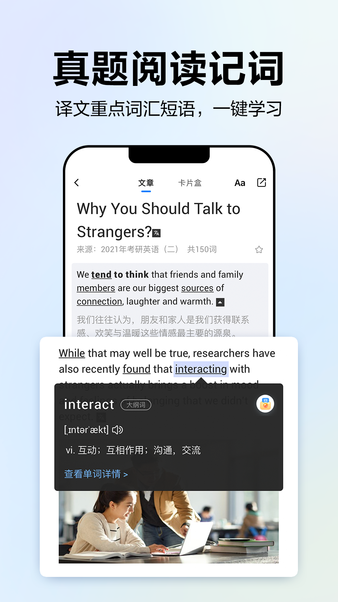 全新开拓语境记词模式,精选核心大纲单词结合历年真题,让单词回归真实语境,在鲜活的实际阅读场景中记住单词。