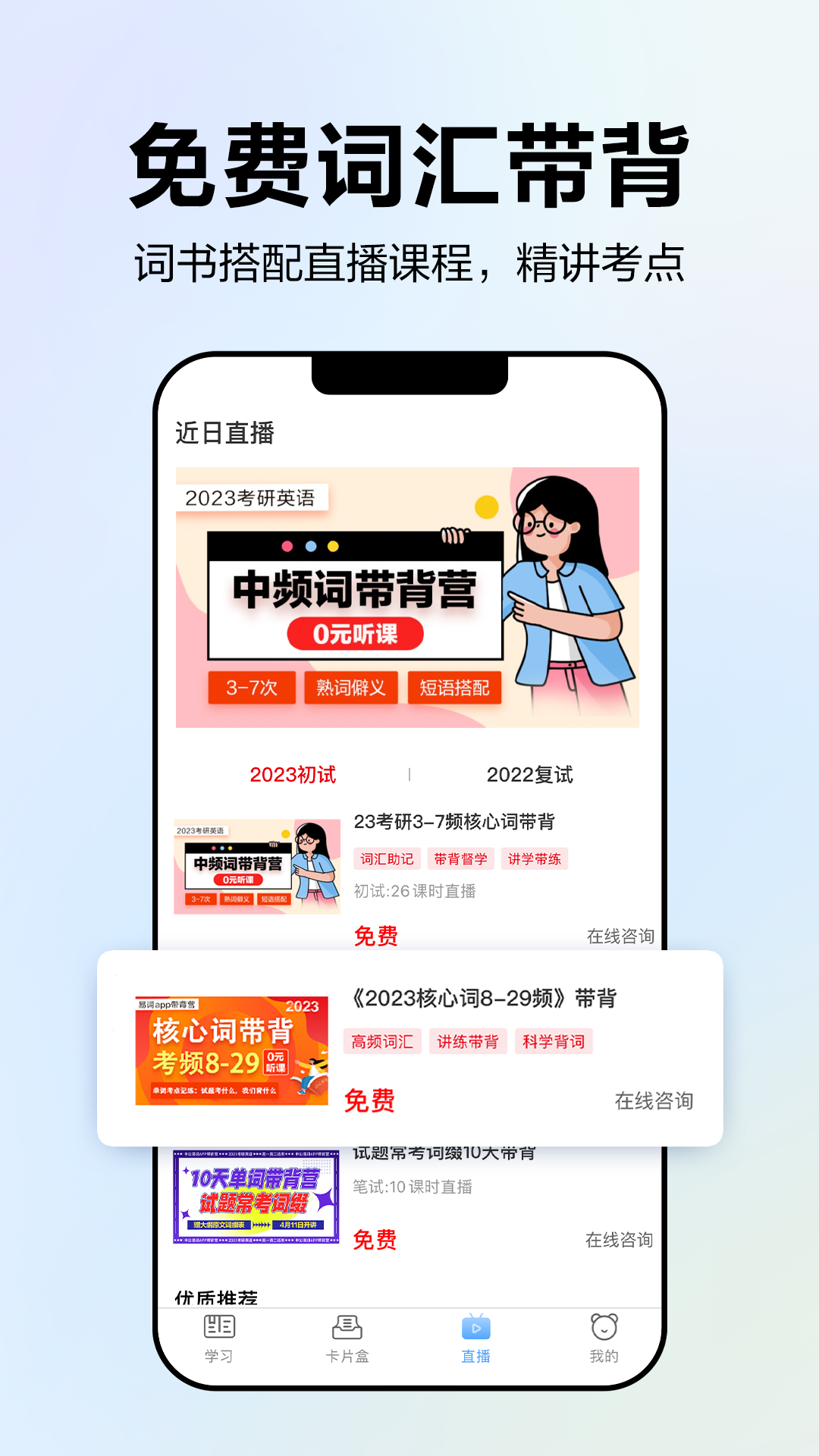 潜心深入内容教研,针对考研和四六级等考试人群的不同需求,设置四类精细化专业词库:大纲词汇,全面提升;高频词汇,进阶提高;核心词汇,突击学习;专属词汇,精准记忆。