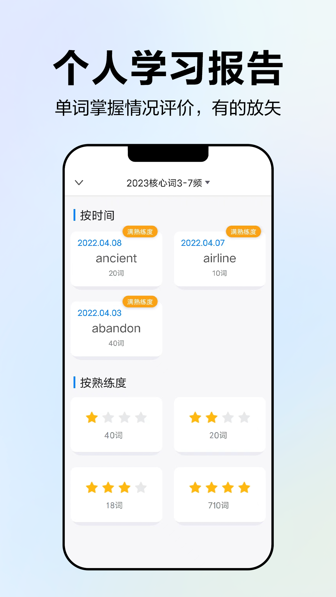精心打磨经典学习流程,将计划学习的单词分成小组,小组内新学、测试、小结、单词回顾一气呵成。一个流程搞定英语单词。