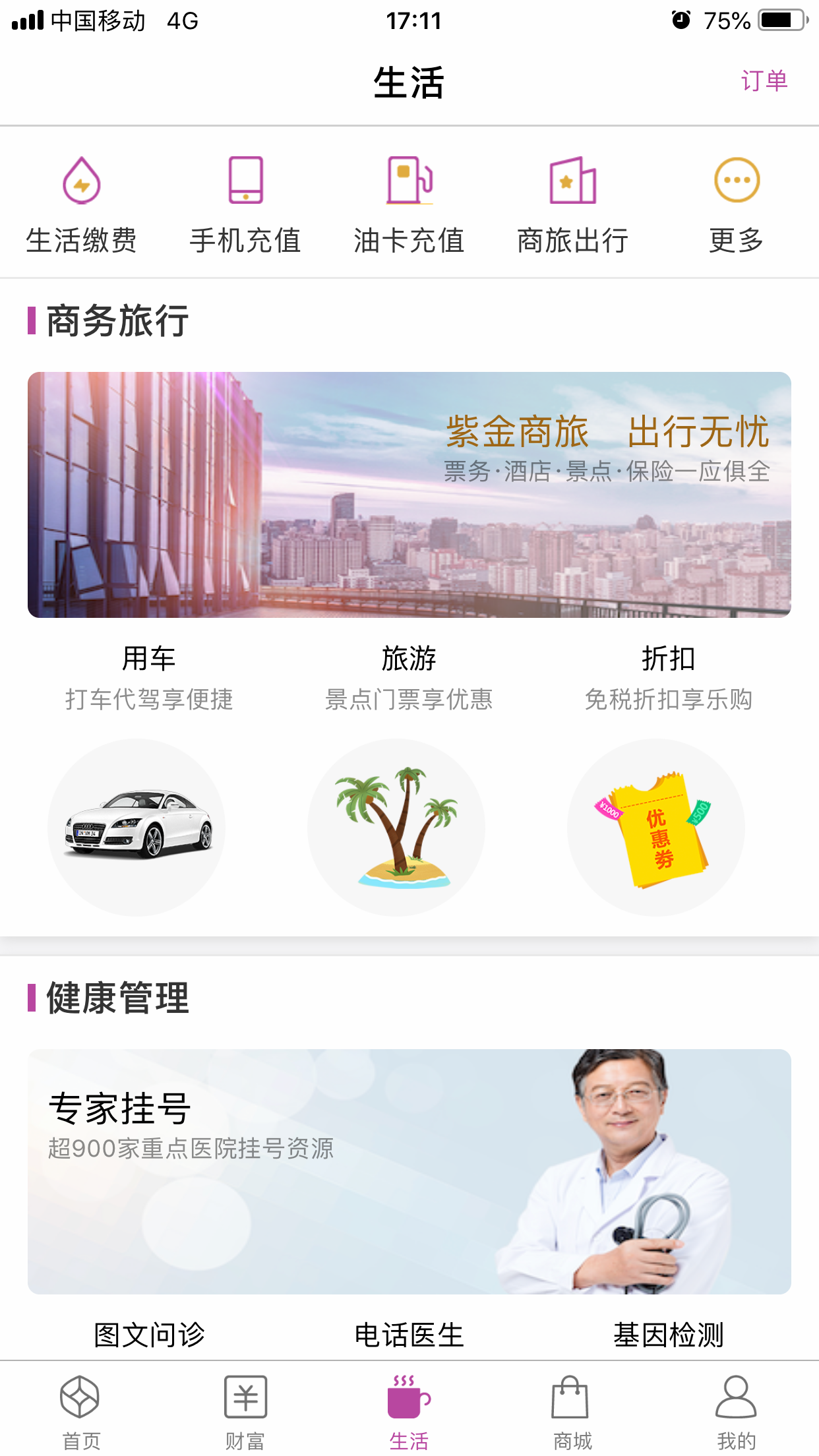 3.便利生活:生活缴费、手机充值、加油卡充值、掌上商城、商旅出行、健康管理,是您贴心的生活好助手!
