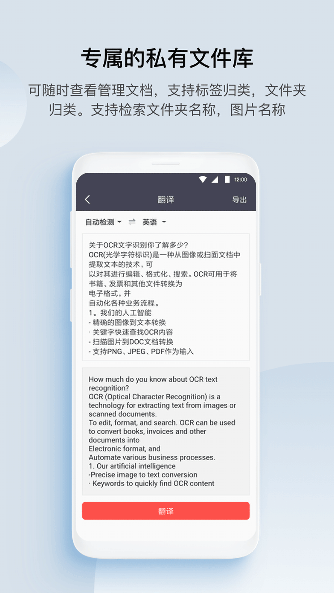 - 可以针对汉语、英语、法语、俄语和西班牙语等56种语言进行识别,并且能无限制地进行翻译,对翻译内容也可编辑、分享。