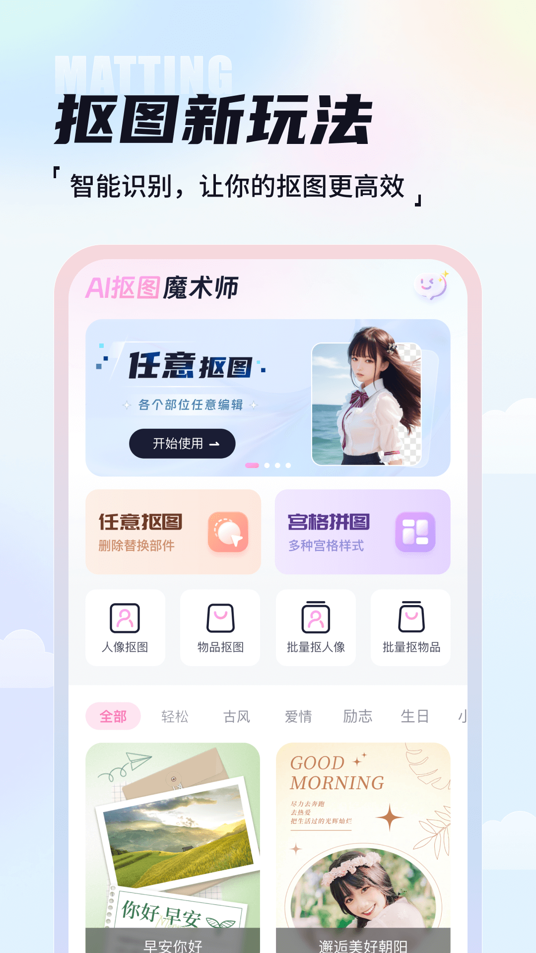 AI抠图魔术师,这是一款超厉害的安卓应用哦,有了它,您就能轻松变身抠图达人,制作出令人过目难忘的照片与海报啦。不需要掌握那些繁杂的图像处理技术,就能顺利进行抠图、拼接图片,还能制作出超级惊艳的海报模板呢。现在就行动起来吧,尽情释放您的创意,让您的照片和海报在众多作品中大放异彩!