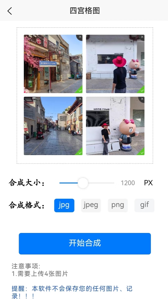 能够合成长图、合成宽图、制作四宫格图以及九宫格图。