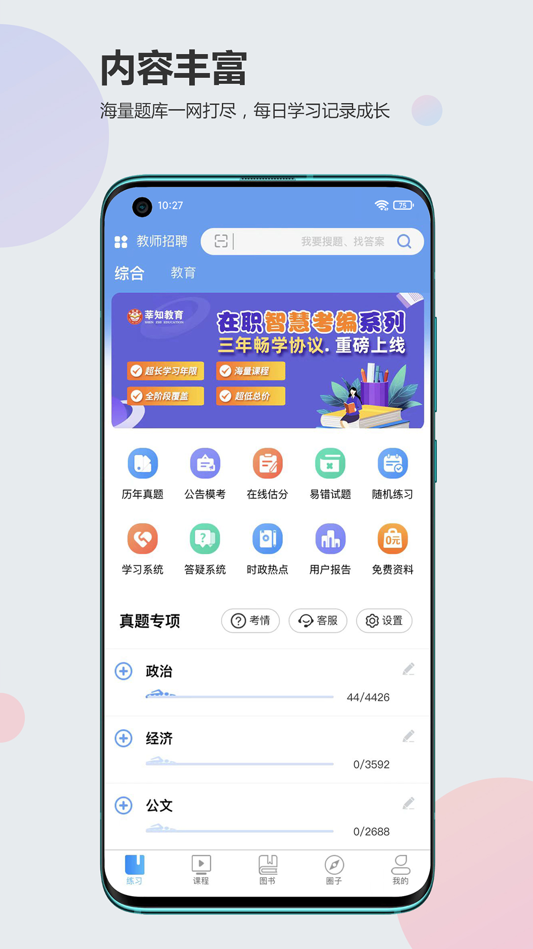 其在线题库处于不断更新的状态,为用户提供近十年教师招聘考试和教师资格证考试的真题,并且附带答案解析。无论是重难点题目,还是易错题,都进行了详细分类,还设有视频解析和专项训练功能。