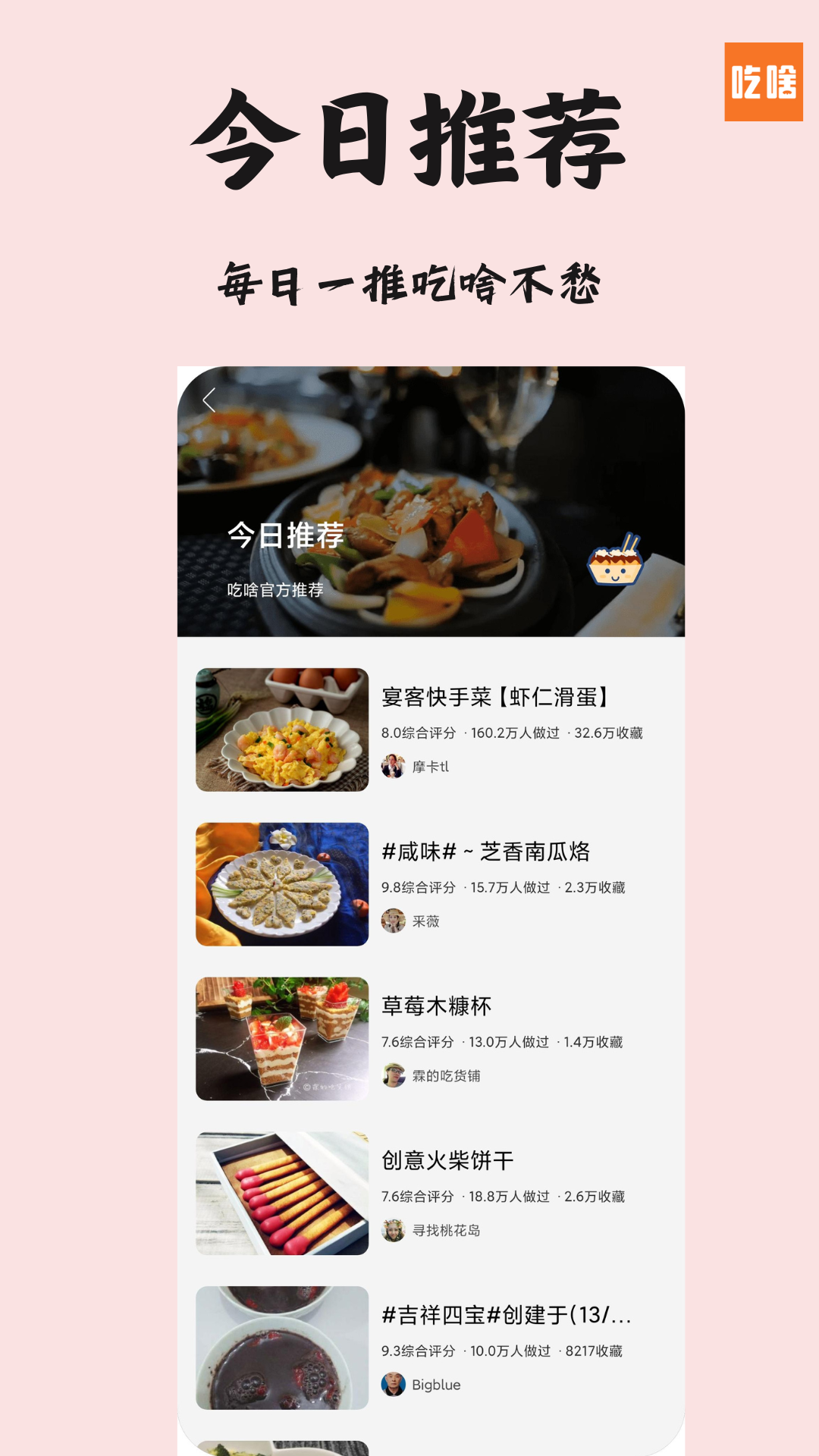 不知道吃啥就来吃啥菜谱。无广告、简洁易用、专为下厨房而设计的菜谱小程序,它可以根据你的口味和食材AI智能推荐适合你的菜谱。吃啥菜谱倡导在家烹饪、健康的生活方式,为人们提供的实用菜谱做法与饮食知识,提供厨师和美食爱好者一个记录、分享的平台。