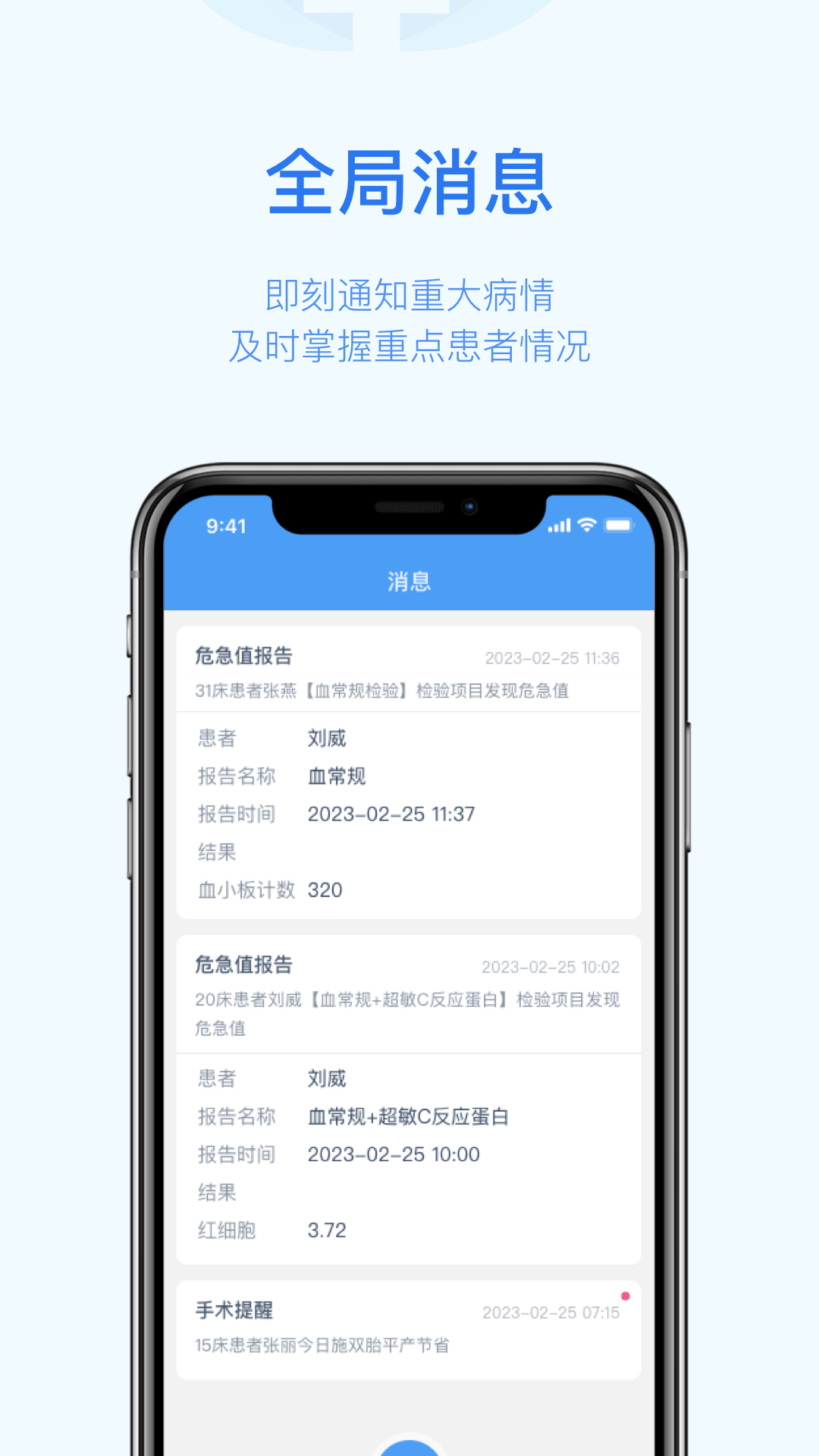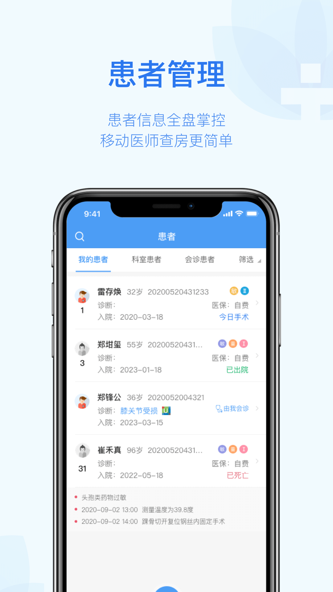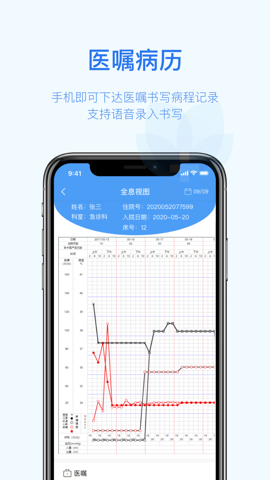 应用于医院临床医生查房,可以查询临床科室住院患者的医嘱、病历、检验、检查等相关信息,帮助临床医生在查房时能够实时获取最新的患者数据,并能在床旁开嘱医嘱,提高医疗效率,提升医疗质量。