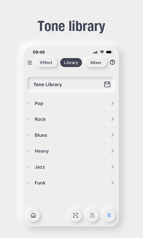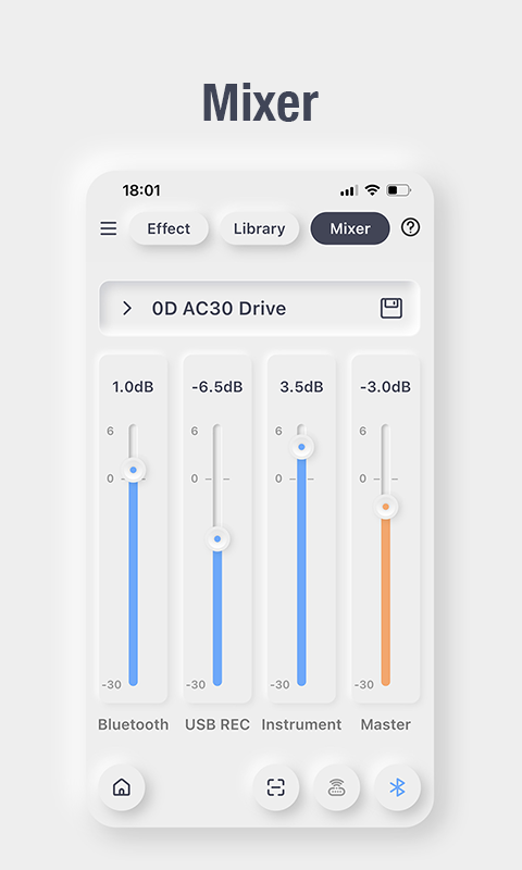 其一,采用稳定且低延迟的蓝牙方案,达成与Mooer iAMP音箱硬件系统的通信,从而能够实时展现Mooer iAMP音箱的工作状态。