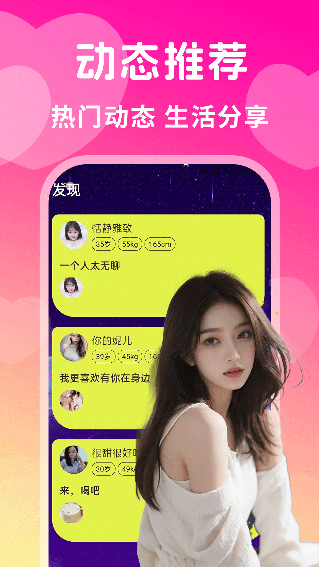 在这里,你可以在线邂逅各种各样的陪聊妹子。不用担心熟人在场的尴尬,你可以大胆地做自己,让你们从陌生开始,逐渐互相了解,走向熟识。