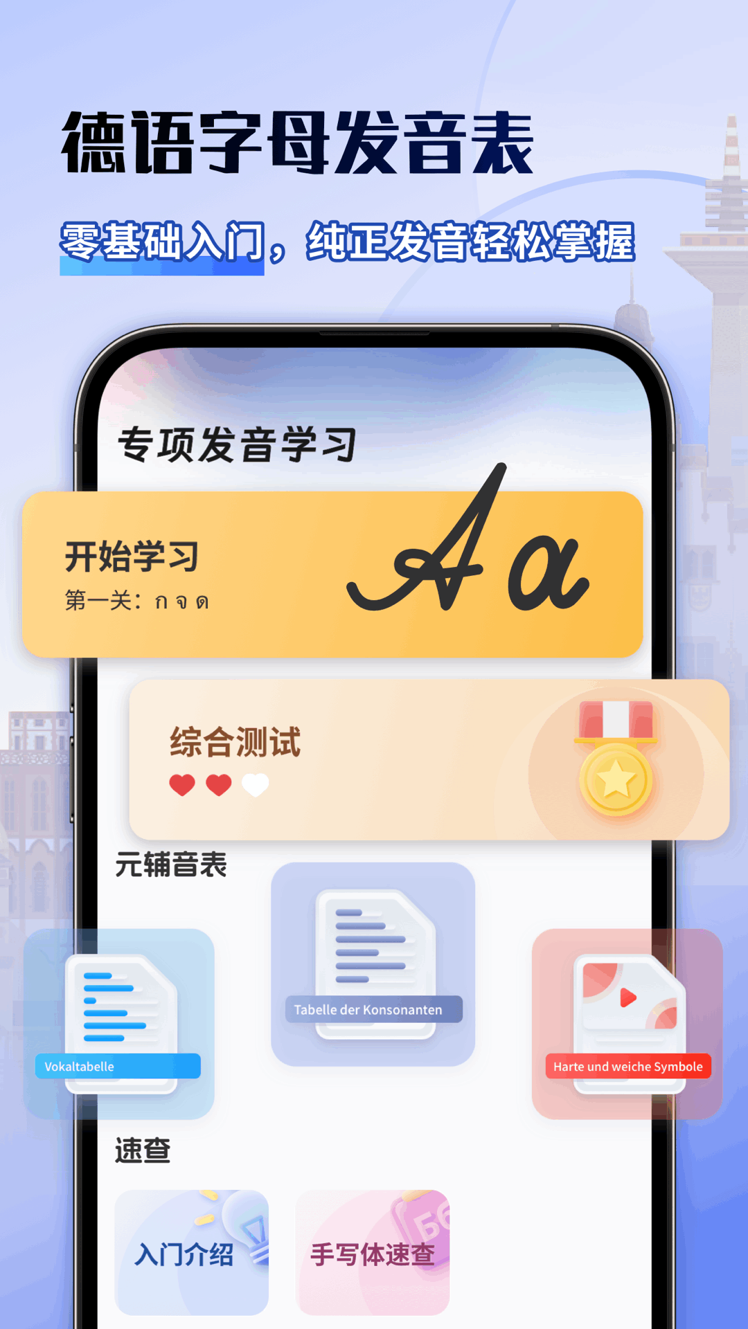 元音辅音基础:要想打好德语基础,得从元音辅音入手。我们特别设置了元音辅音学习模块,结合生动的图片、发音示范以及练习题,帮助您精确掌握发音技巧。