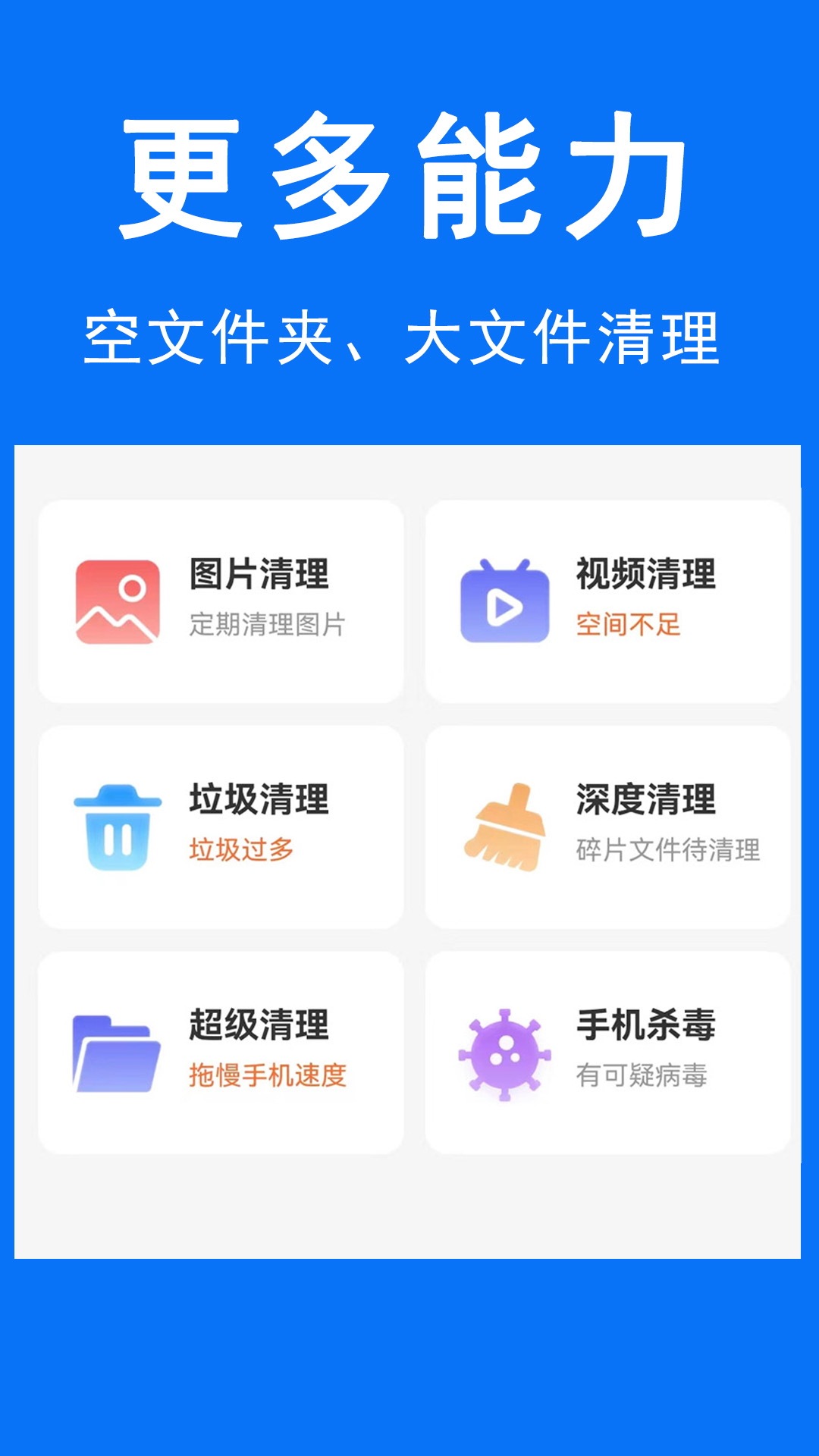无忧清理大师是一个实用的清理工具,功能强,能全面清理手机垃圾,独有的垃圾文件扫描引擎,能够深度清理手机垃圾,有效解决手机使用过程中的手机空间不足问题。