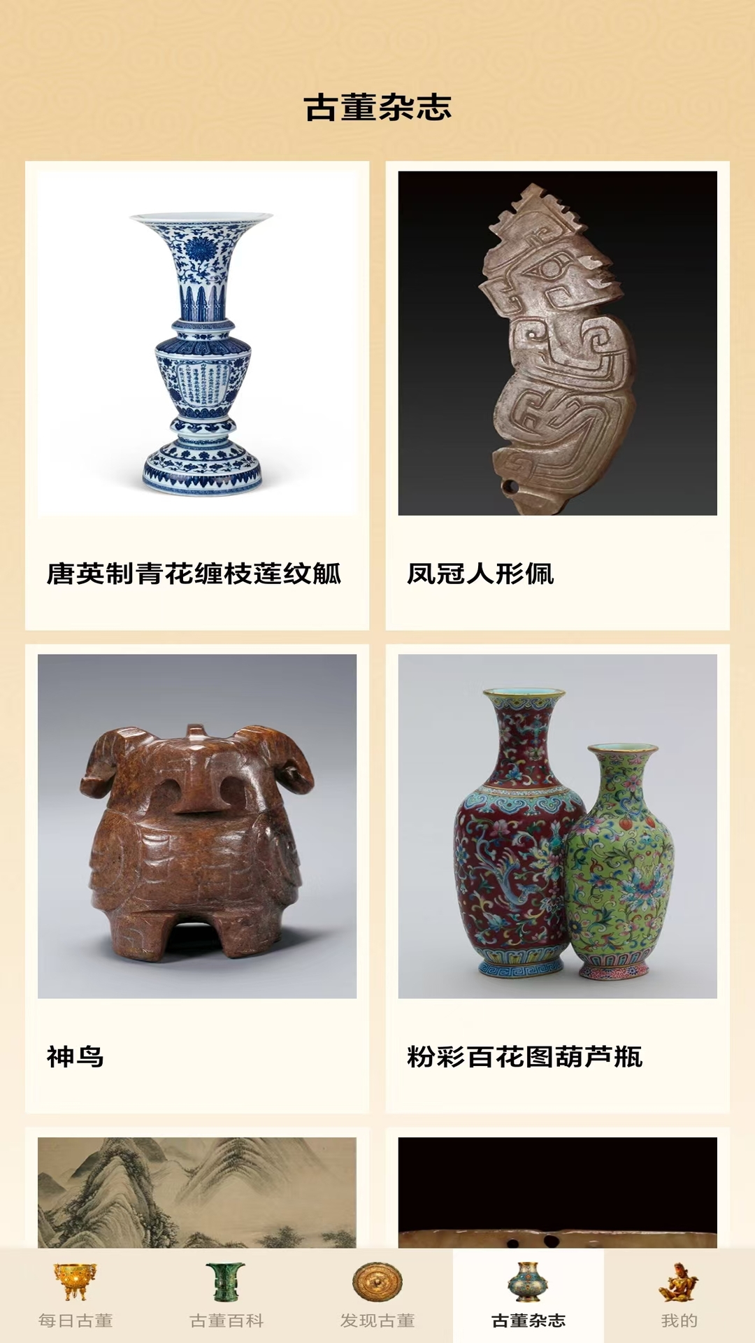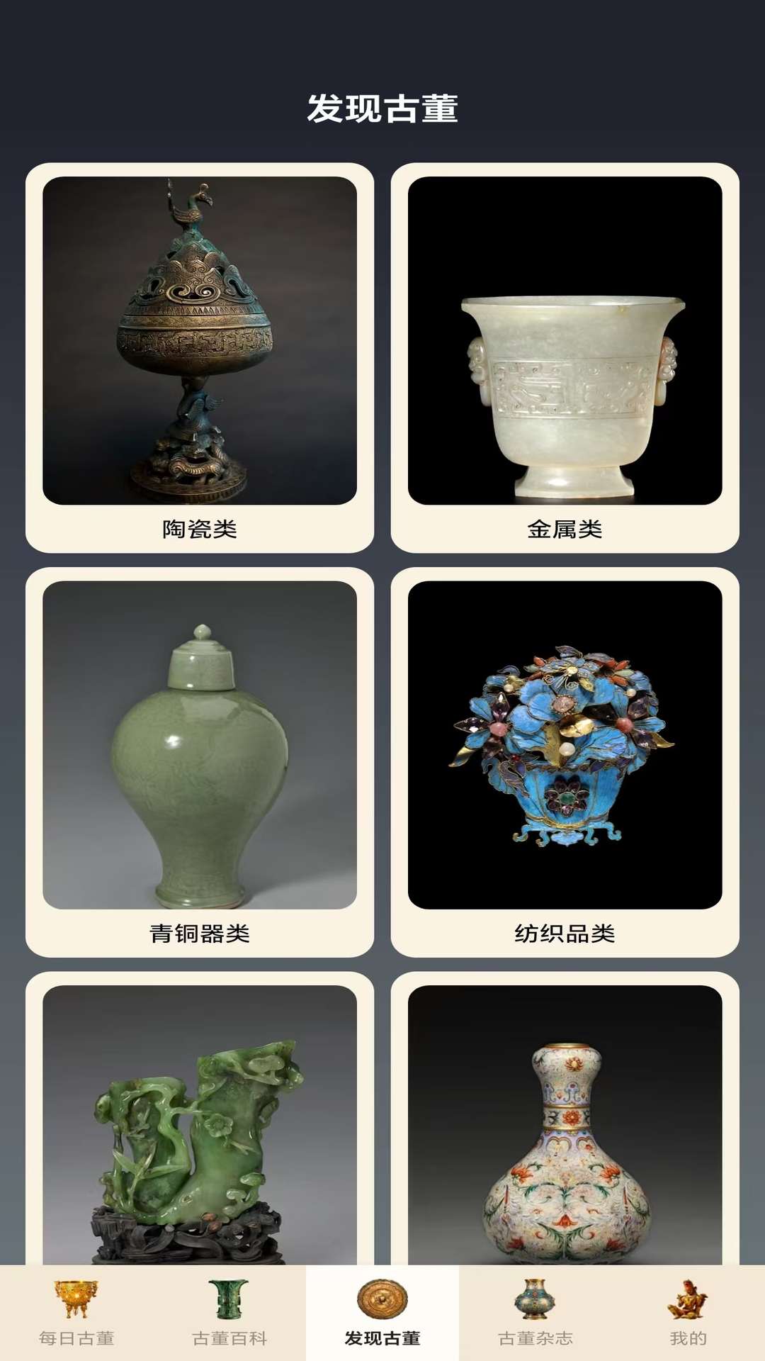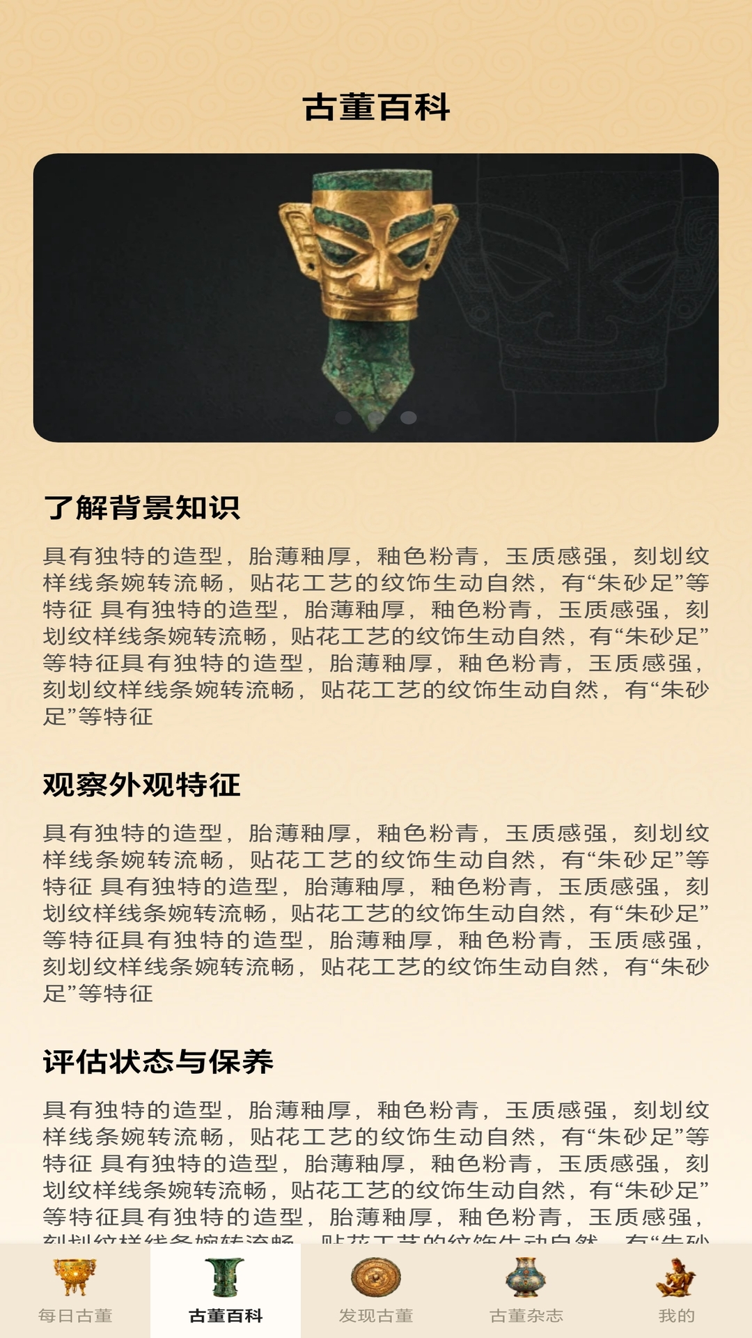 多宝古董是一款专为古董爱好者、收藏家以及历史文化爱好者打造的全方位古董科普应用。探索岁月长河中的瑰宝,从古董百科到种类介绍,再到精致工艺品的背后故事,带你走进一个跨越时空的世界。