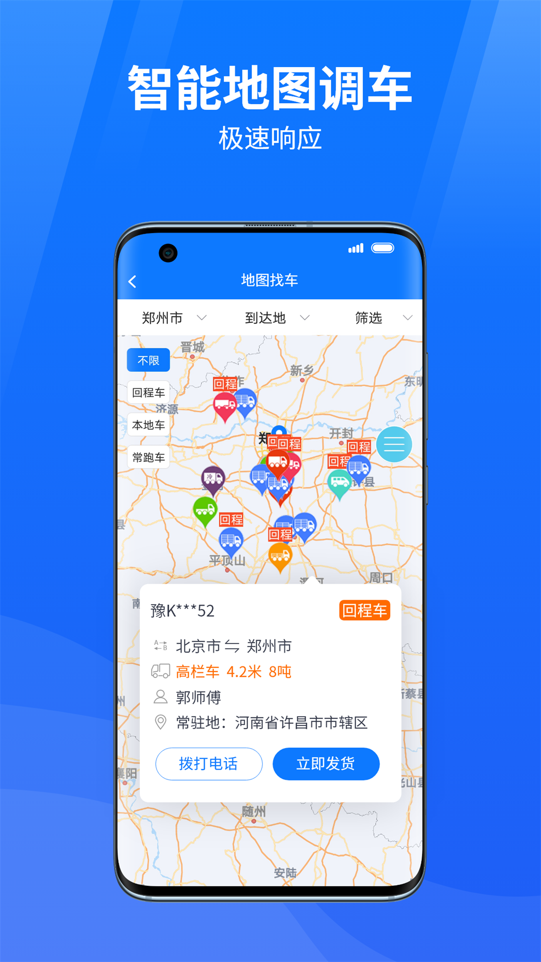 - 地图找车:借助地图找车功能,可以迅速调配全国的回程车和常跑车。