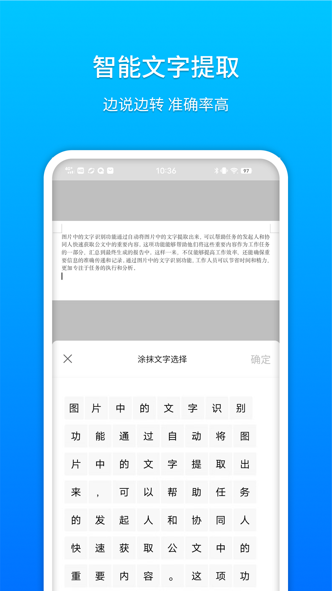 借助图像处理与文本识别算法,此功能可对输入的图片进行分析,提取图片中的文字内容并转录,将其转换为可编辑的文本格式。并且,用户可以通过划词的方式来选取识别出的文字。