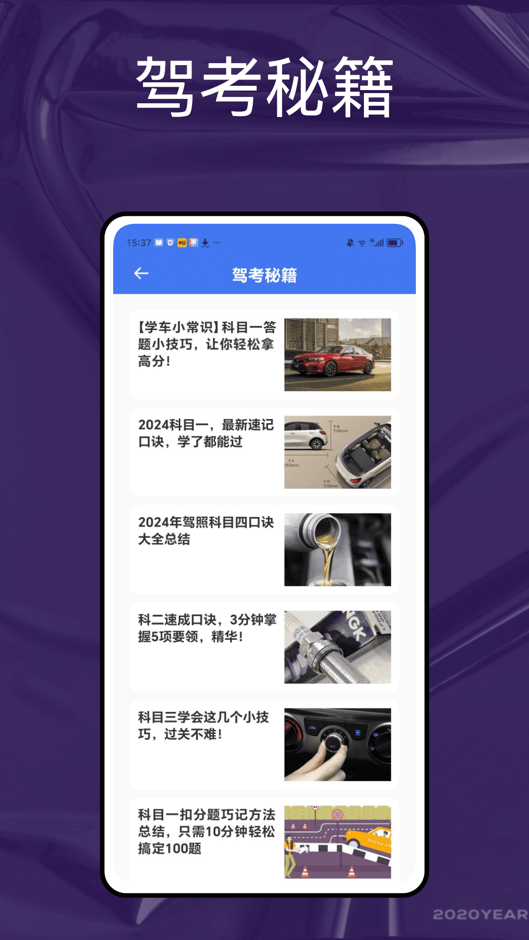 APP的驾考秘籍功能也十分实用,它为用户准备了大量的学习资料以及考试技巧,助力用户顺利考取驾照。